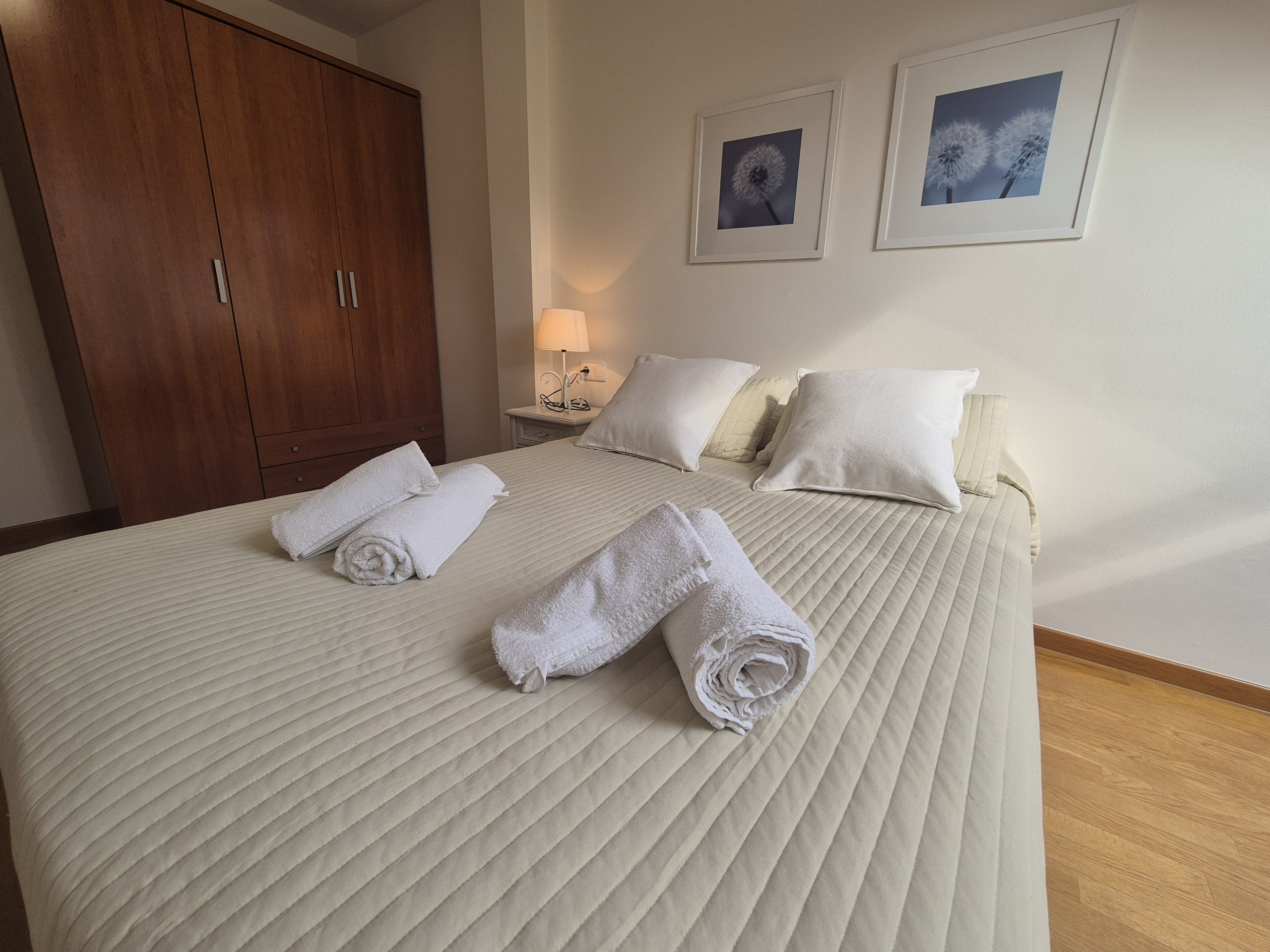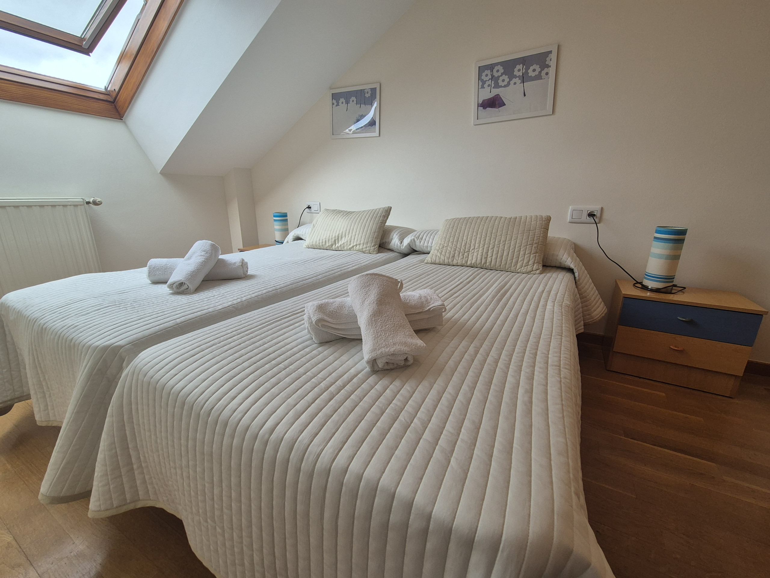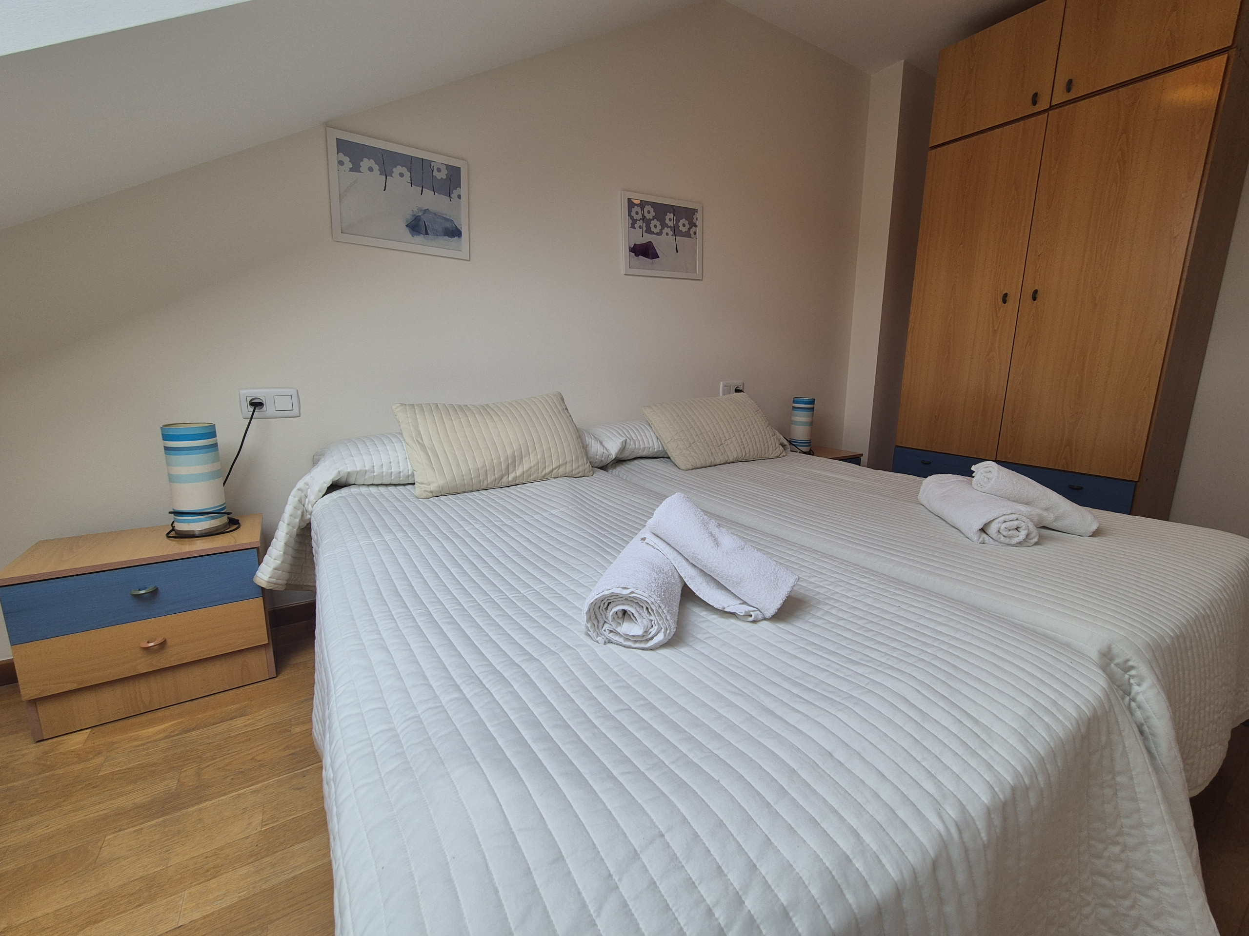 se trata de un apartamento con salón comedor. cocina independiente y dos dormitorios. una habitación es interior a caja de escalera con dos camas individuales y la otra con cama matrimonial.