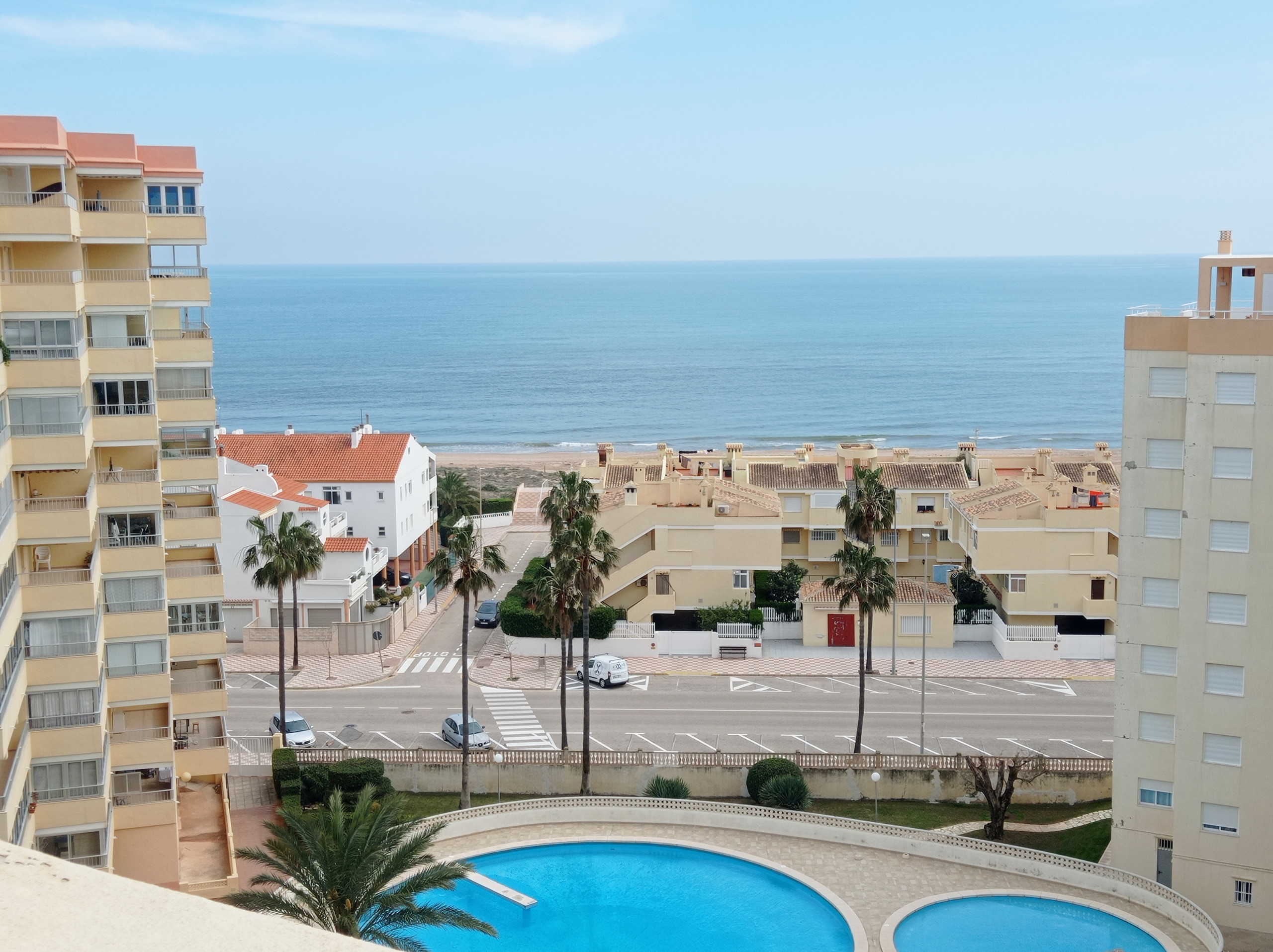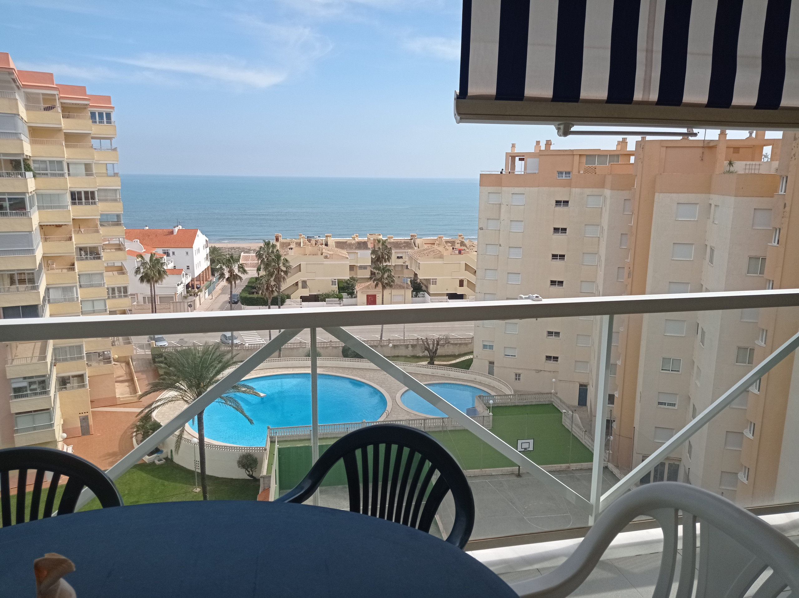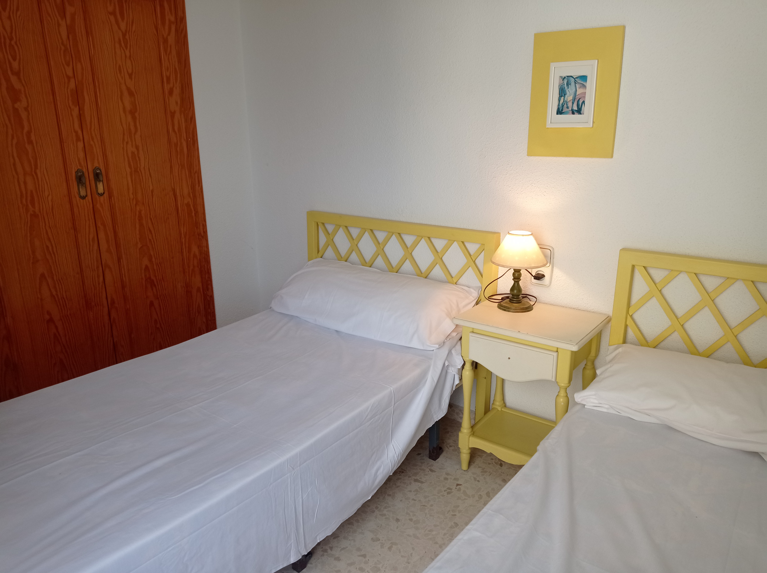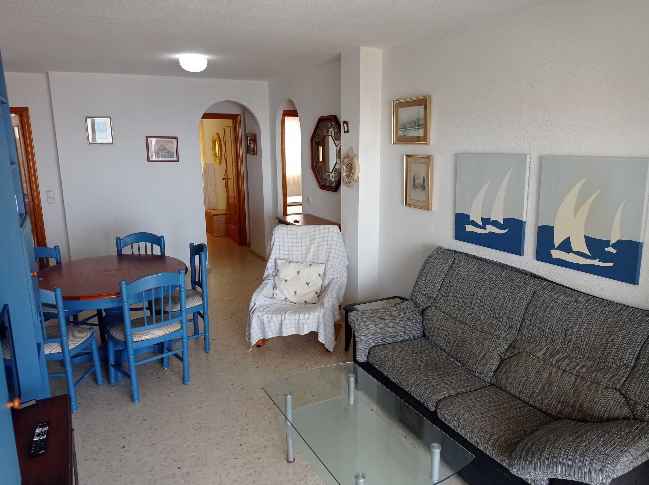 El apartamento en cuarta planta, con tres dormitorios dobles, un baño completo con plato de ducha, cocina independiente y salón comedor con salida a una terraza (con toldo) de orientación norte lateral. También una segunda terraza de orientación Sur con toldo con acceso desde la cocina. Vistas al mar desde ambas terrazas. Incluye servicio WIFI. Tiene aire acondicionado en el salón y en el dormitorio principal, así como ventiladores en las habitaciones secundarias.