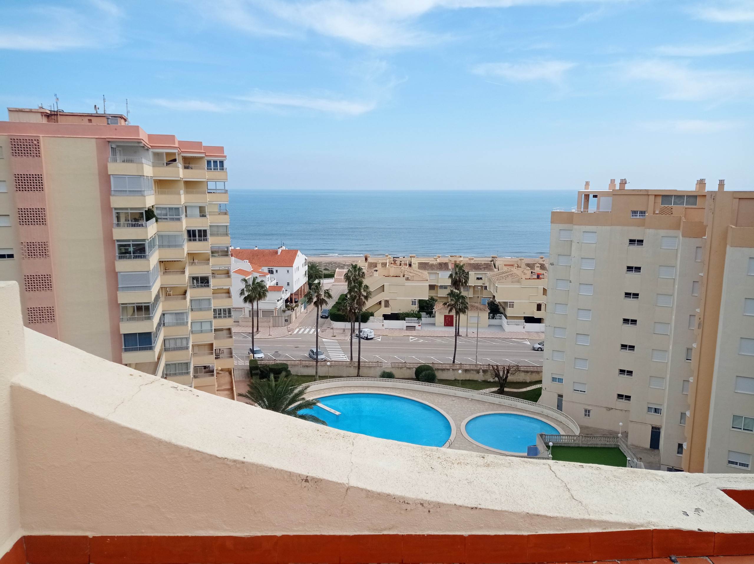 Bonito y espacioso apartamento con tres dormitorios, un baño (con bañera), un aseo-ducha, y cocina independiente con acceso por unas escaleras exteriores a una amplia terraza superior. Cómodo salón con salida a una bonita y recogida terraza de orientación Este frontal con toldo desde donde disfrutar de vistas al mar, a la piscina y a la zonas comunes ajardinadas. Equipado con ventiladores de techo en todos los dormitorios, tiene servicio WIFI e incluye plaza de garaje.