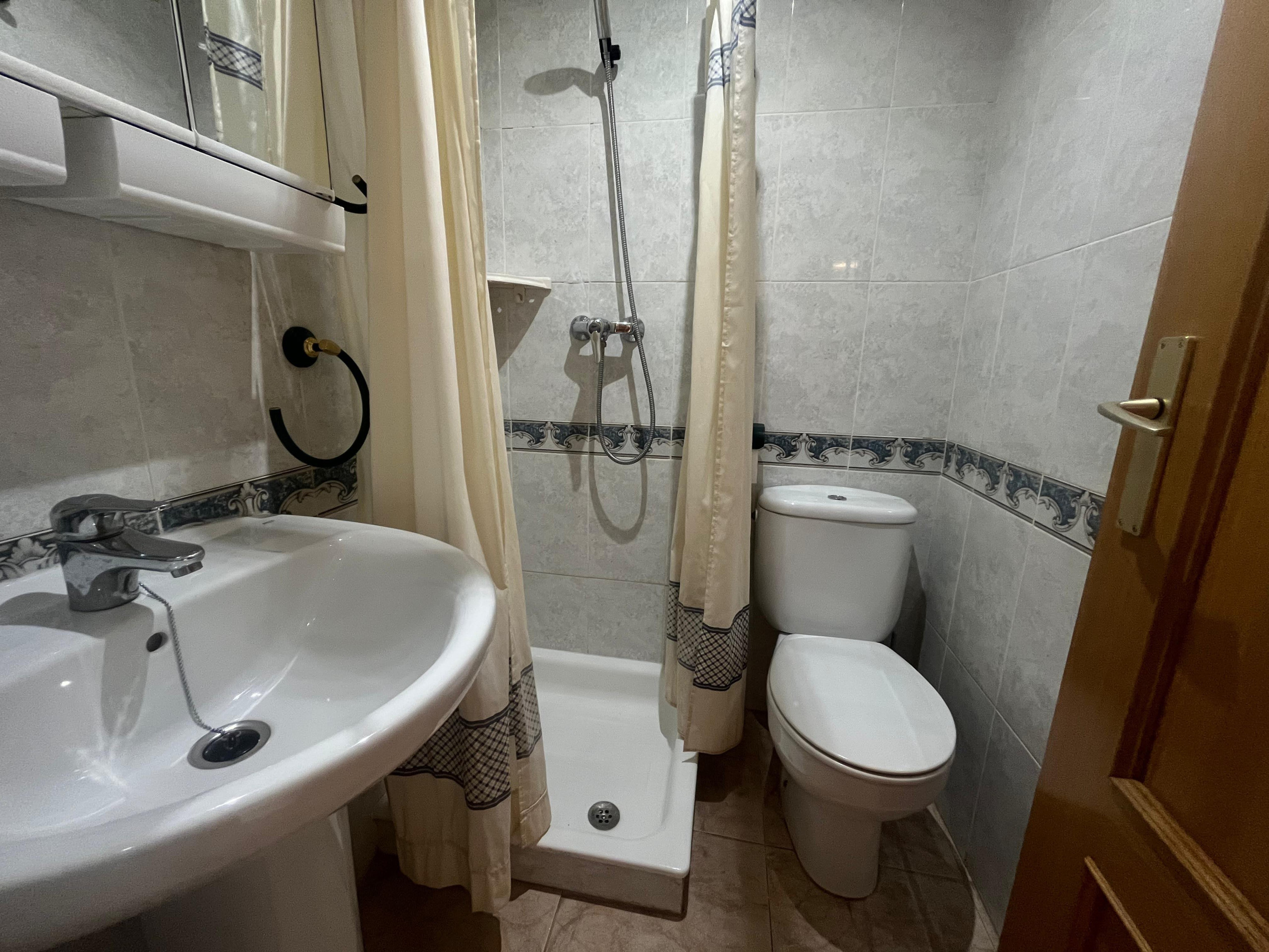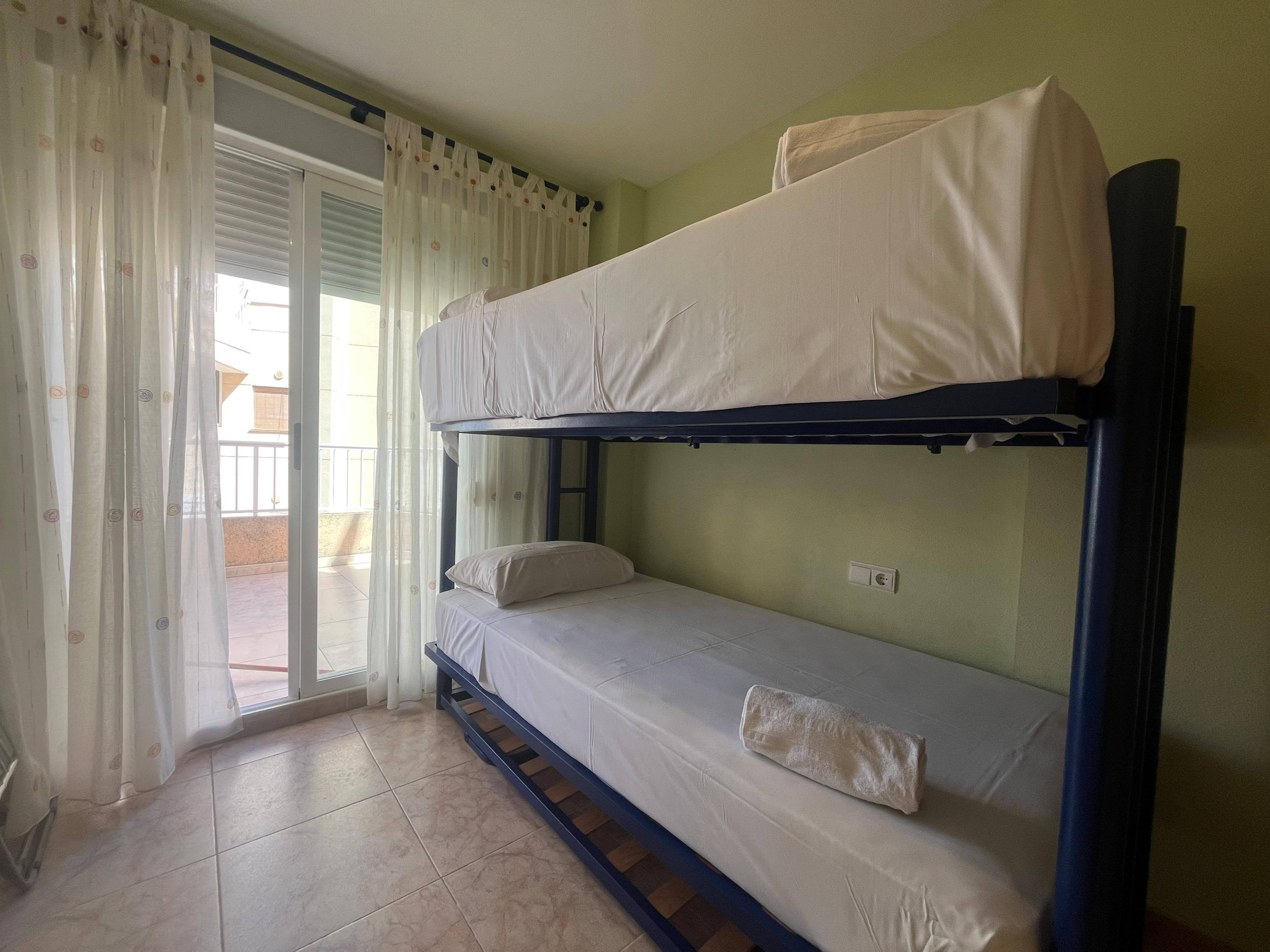 Apartamento en segunda planta con terraza de orientación Sur con toldos. Tiene un dormitorio doble, un salón estar- comedor con sofá cama para 2 personas (1,20 cm), cocina americana al salón y un cuarto de baño con bañera.