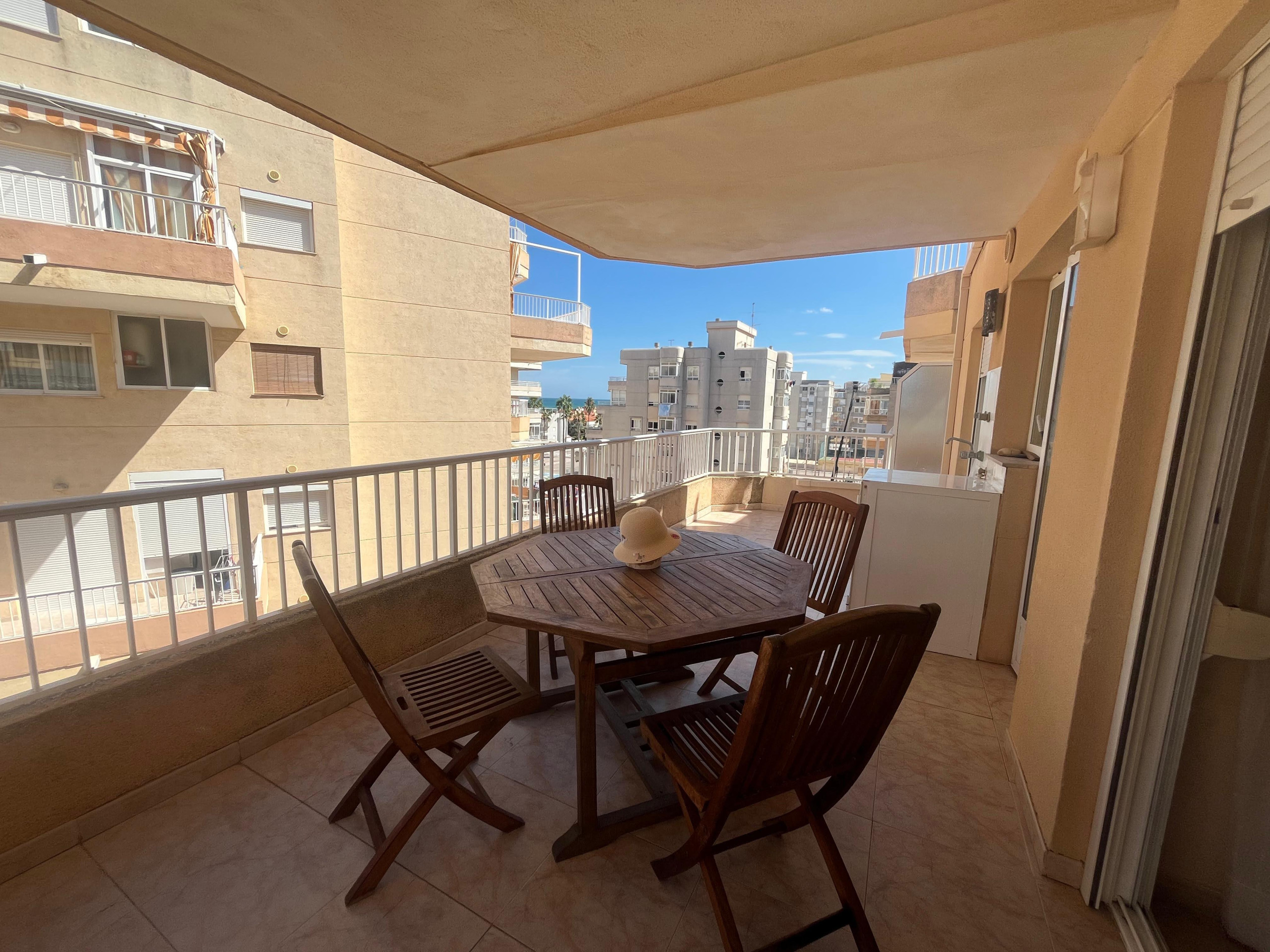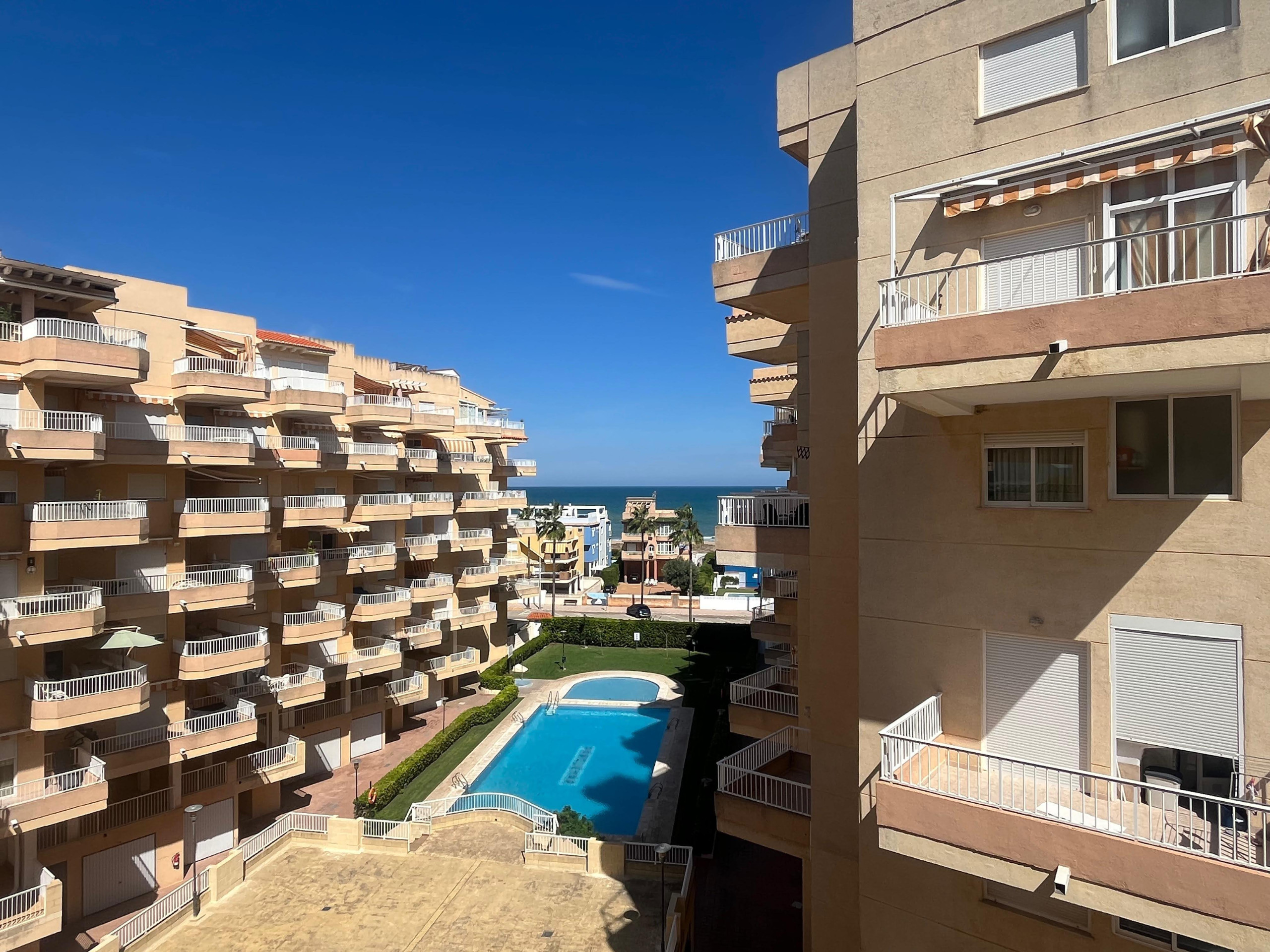 Apartamento con dos dormitorios, dos baños (uno con plato de ducha), cocina independiente y salón comedor, ambos con salida a una amplia terraza de orientación Este con vistas al mar y a la piscina. Ofrece aire acondicionado en el salón-comedor. Incluye plaza de aparcamiento y servicio WIFI..