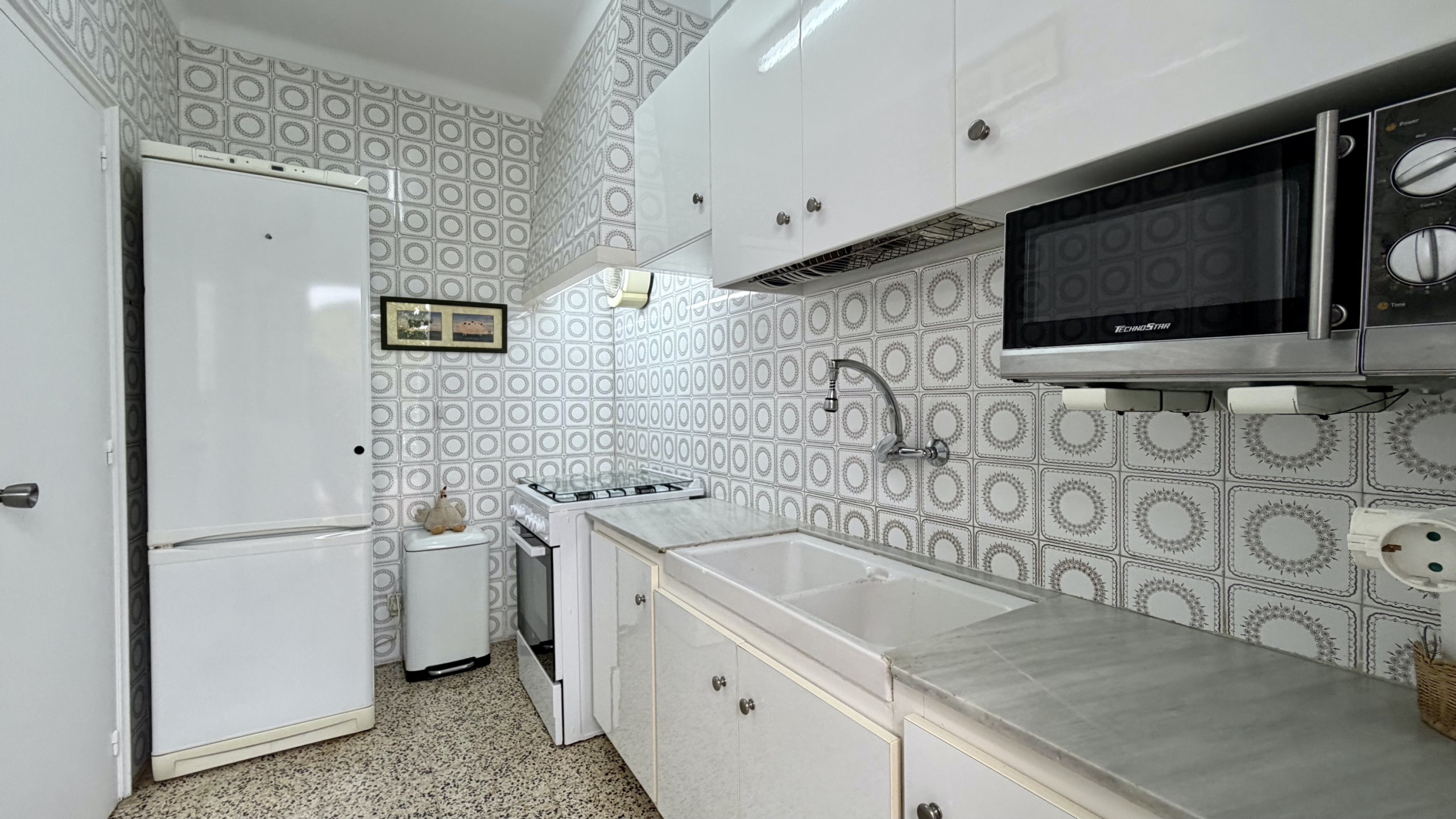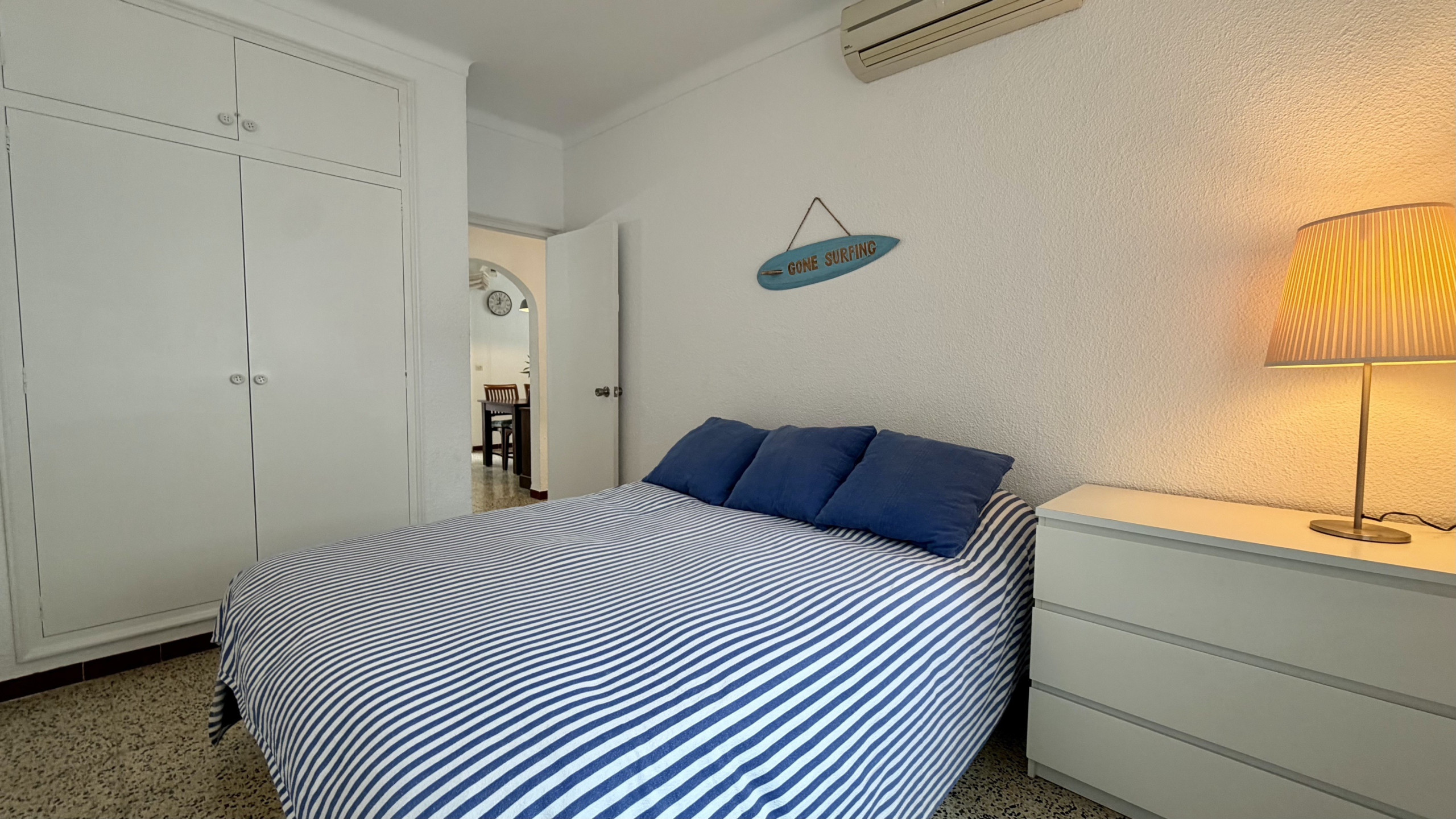 El apartamento cuenta con dos dormitorios bien equipados: una habitación con cama doble, otra con litera y un sofá-cama adicional, garantizando un descanso cómodo para todos los huéspedes. Dispone de un único cuarto de baño con bañera, perfecto para relajarse después de un día de playa.