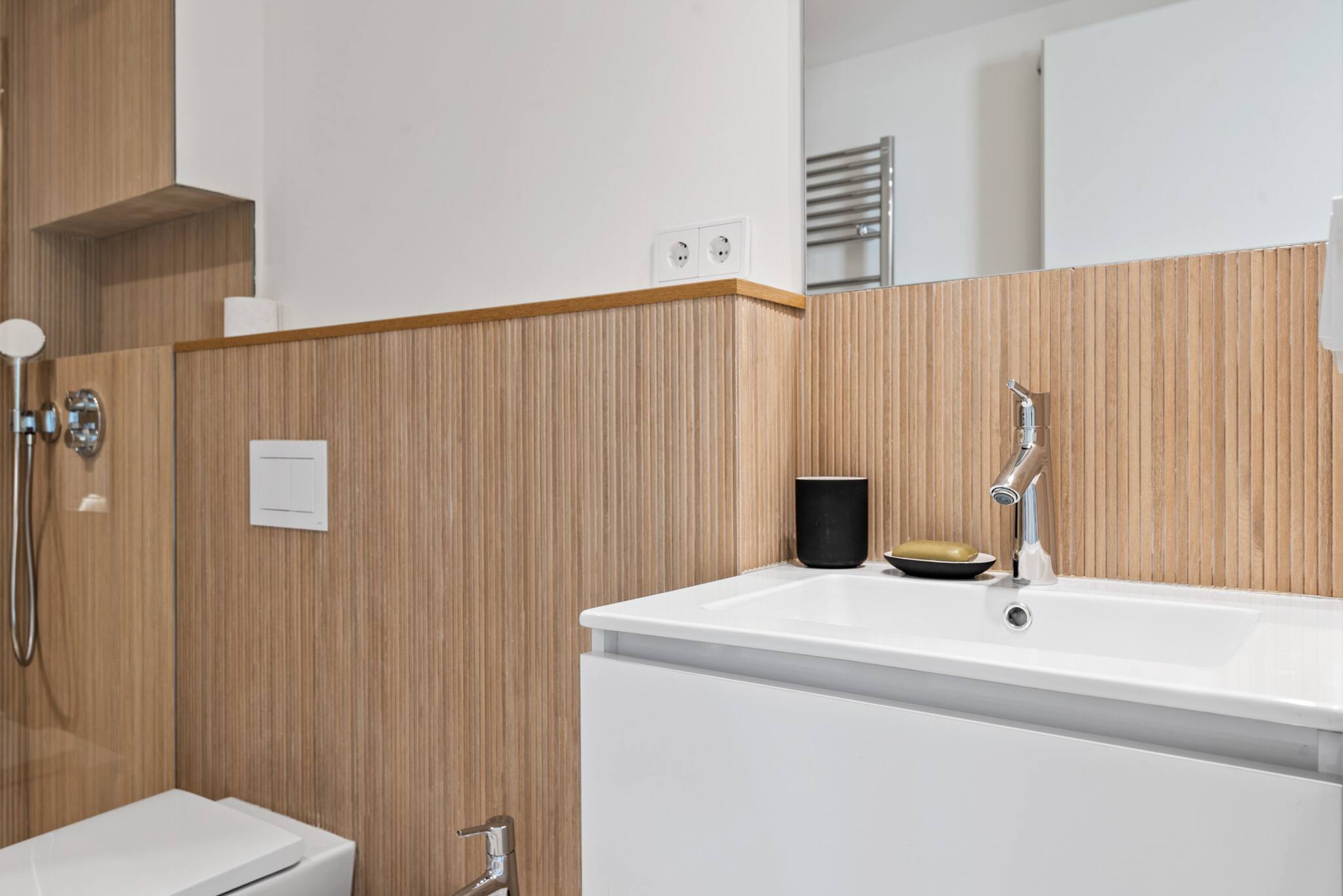 En el exterior, una gran terraza envolvente te invita a tomar el sol, disfrutar de una barbacoa y comer al aire libre. En la planta superior, dos terrazas más pequeñas ofrecen vistas parciales al mar. La piscina y el jardín comunitarios, rodeados de palmeras, proporcionan un entorno pintoresco para relajarte.