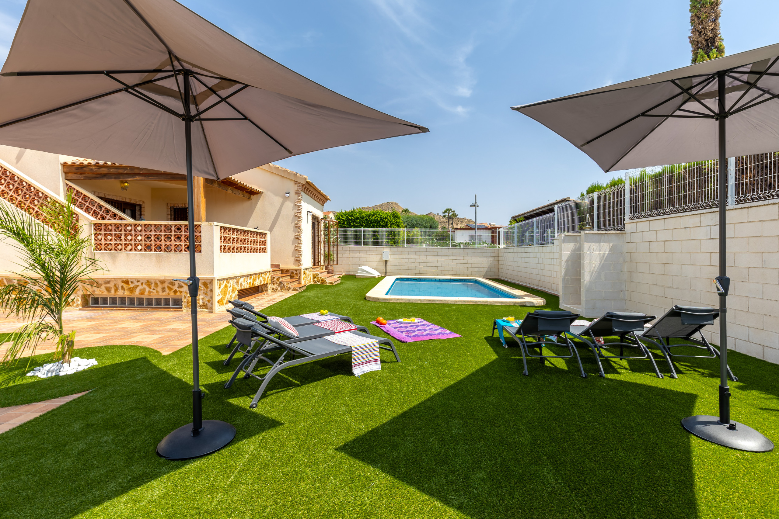 El área exterior es perfecta para relajarse, con una piscina privada rodeada de vistas a la montaña, una barbacoa para preparar comidas al aire libre, y aparcamiento para 2 coches dentro de la finca.