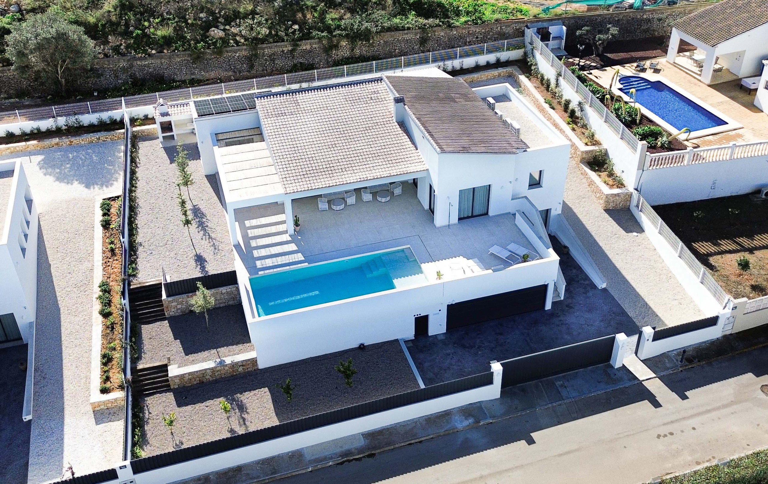 La villa se distribuye en 2 alturas a la que se accede por un pequeño tramo de escaleras que da a una bonita terraza cubierta. Con cocina americana abierta al salón comedor, 5 dormitorios y 4 baños.