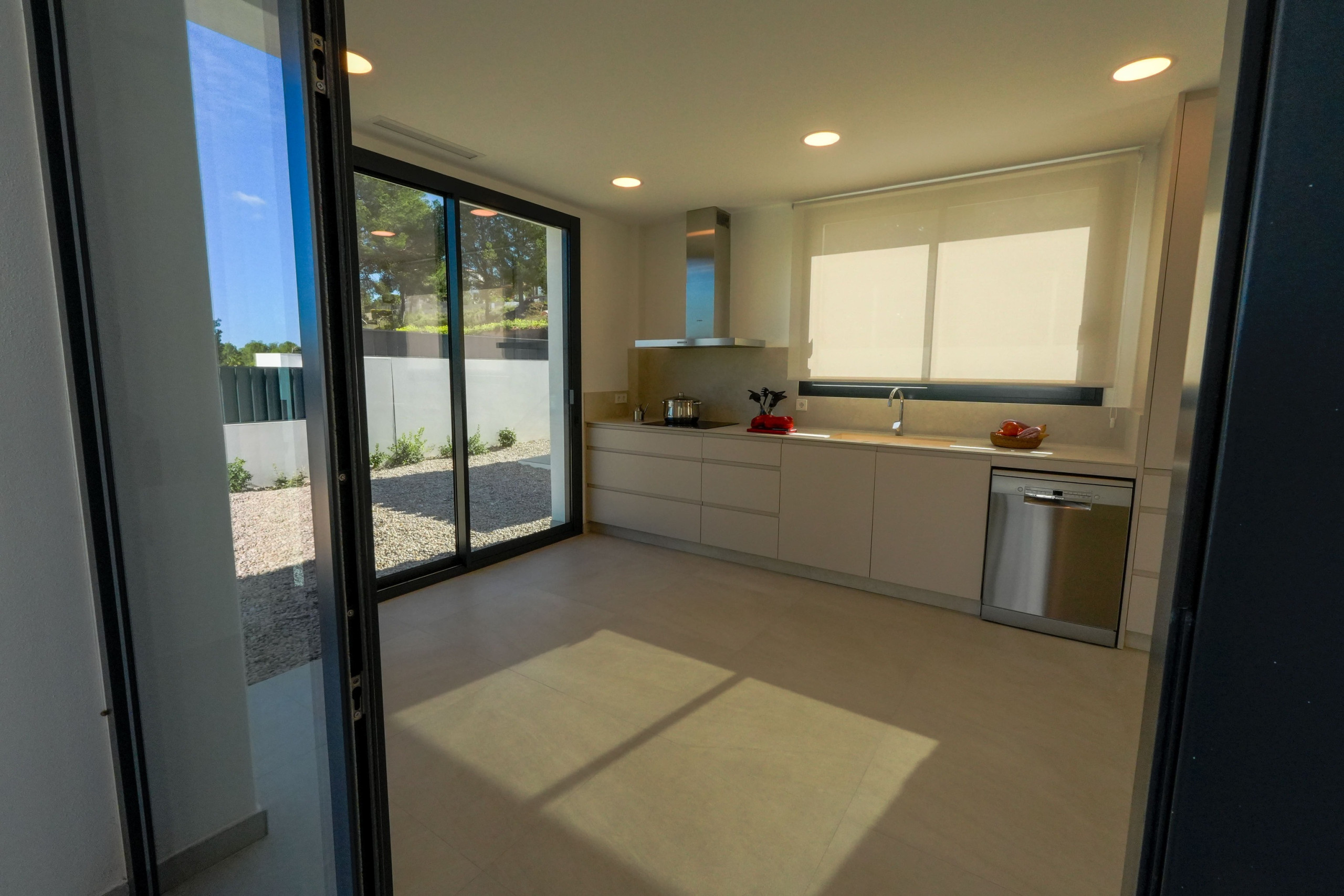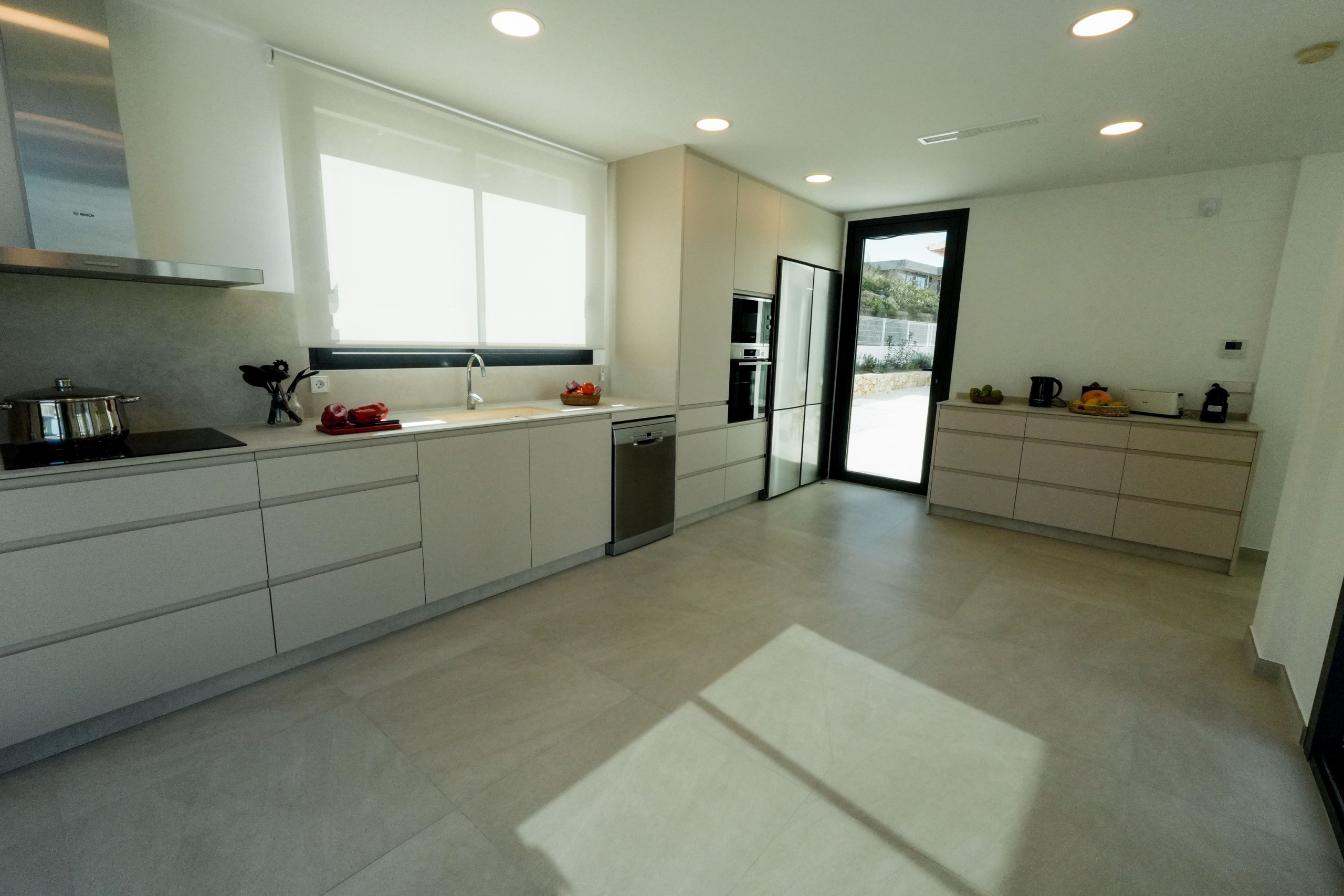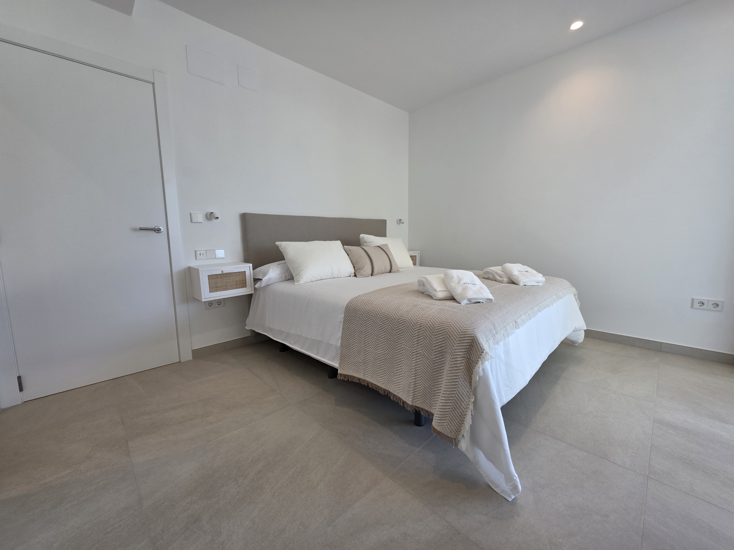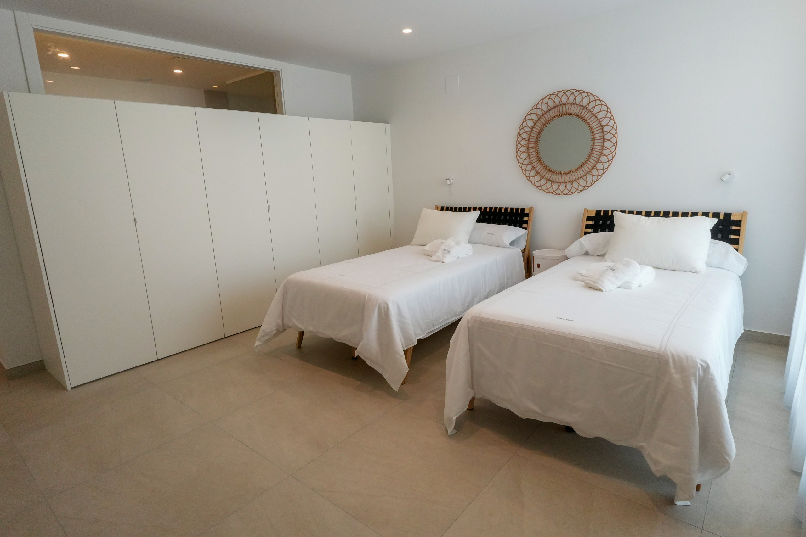 La entrada principal de la villa está en la 1ª planta, desde el recibidor accedemos al salón- comedor con cristalera a la zona de terraza de la piscina y a una segunda terraza situada al otro lado del salón. En esta planta se encuentran 2 dormitorios con cama de matrimonio King size (180cm) y 2 dormitorios dobles con camas individuales, todos ellos con baño en suite. La cocina totalmente equipada con vitrocerámica, horno, microondas, etc… dispone de 2 frigoríficos combi y de todos los utensilios y enseres necesarios y salida a la terraza de la barbacoa. – Todas las terrazas están unidas entre sí por el exterior. Está planta también dispone de 2 aseos de cortesía, uno interior y otro con acceso desde la terraza de la barbacoa.
