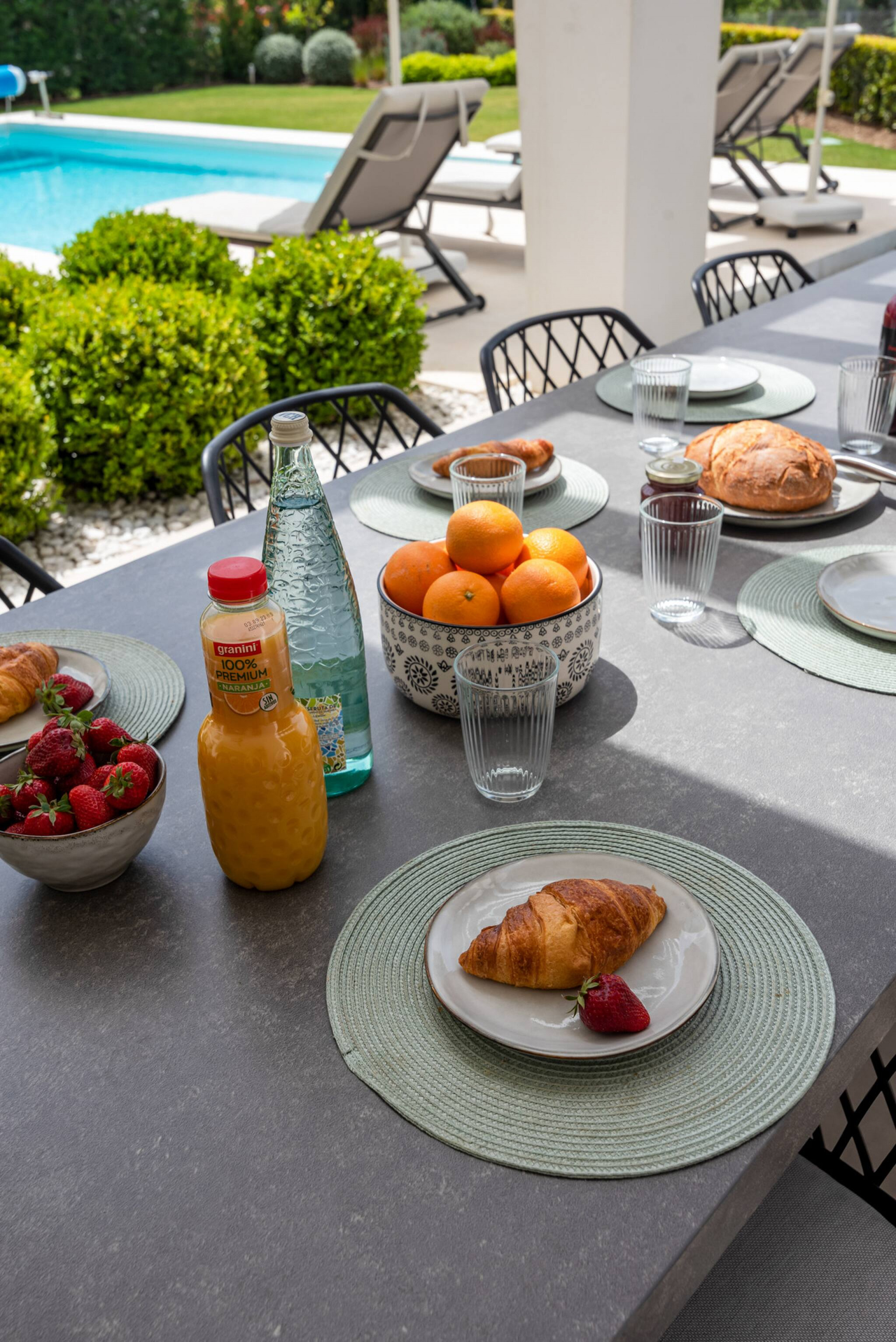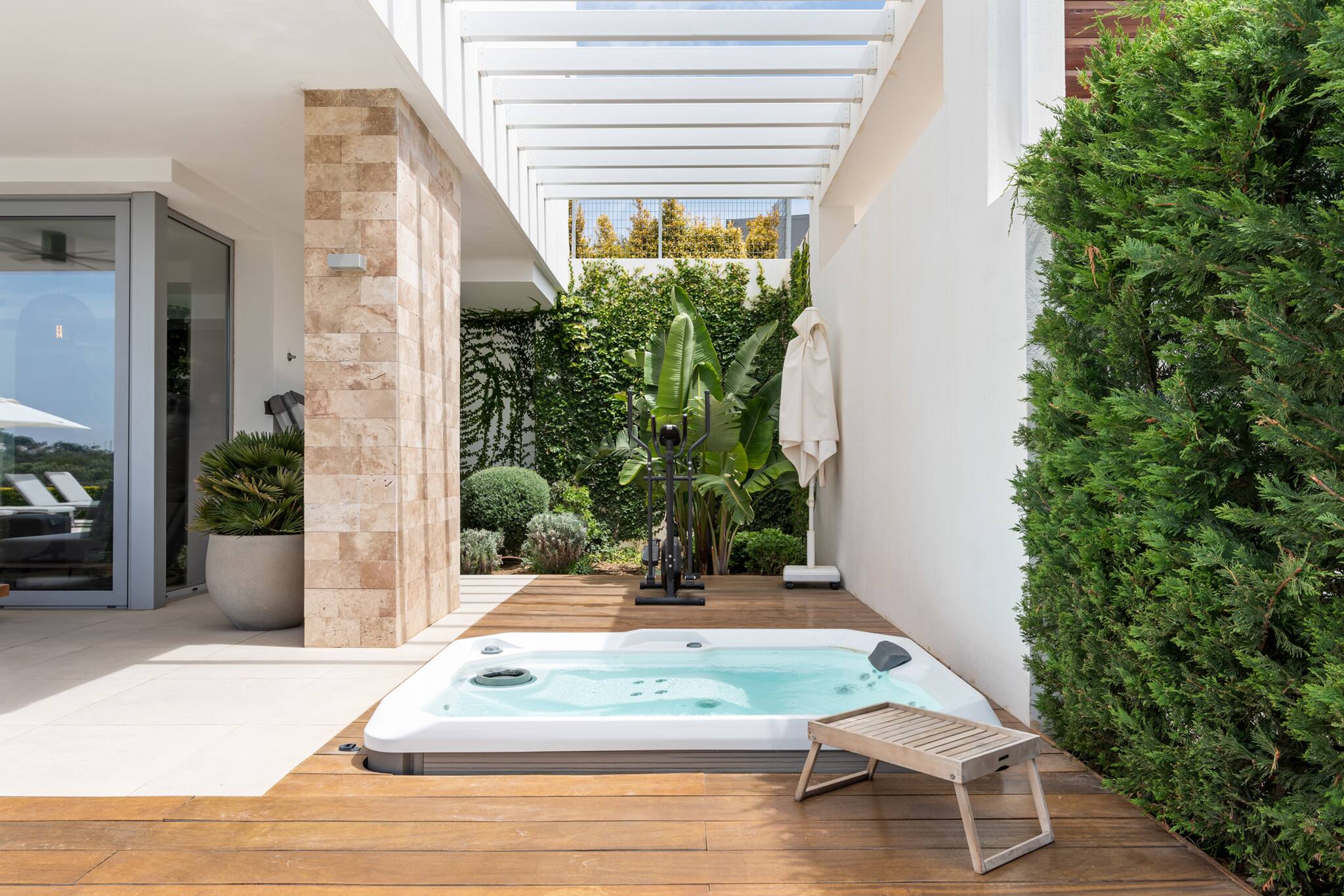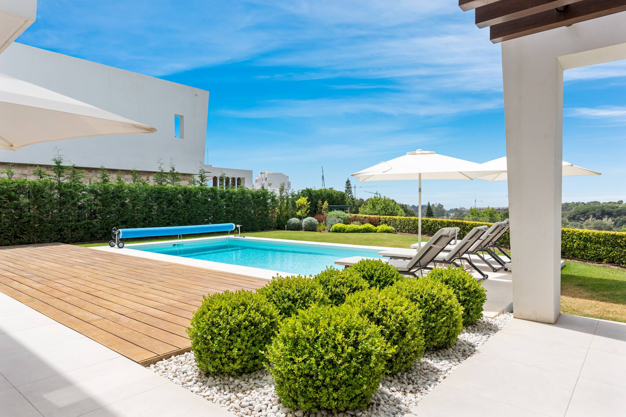 La villa dispone de un amplio jardín privado con piscina, lo que la convierte en un espacio ideal para que los niños jueguen con total libertad.