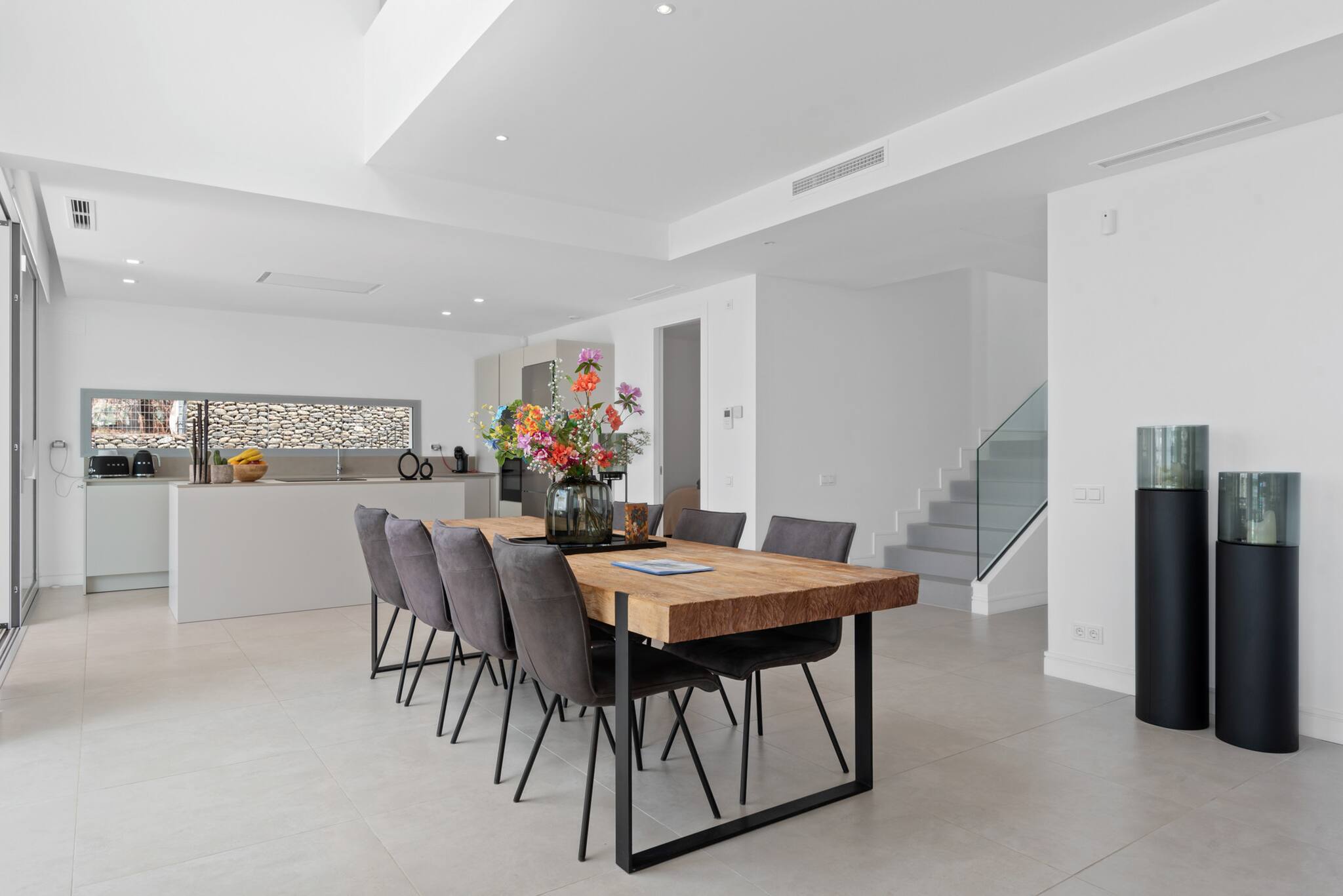 Es un espacio diáfano con grandes ventanales que permiten la entrada de luz natural. La cocina está equipada con electrodomésticos modernos, materiales de alta calidad y una zona de comedor interior para 8 personas.