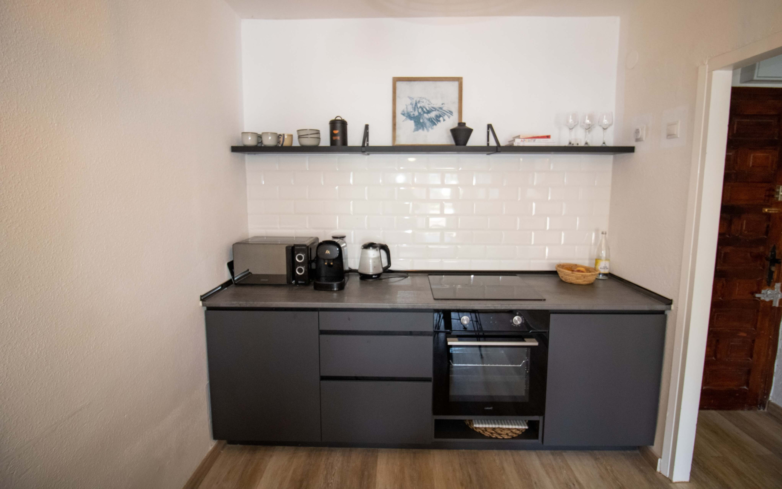 In the hotplate of glass ceramics open plan kitchen, refrigerator, microwave, kitchen utensils, coffee machine and toaster are provided.