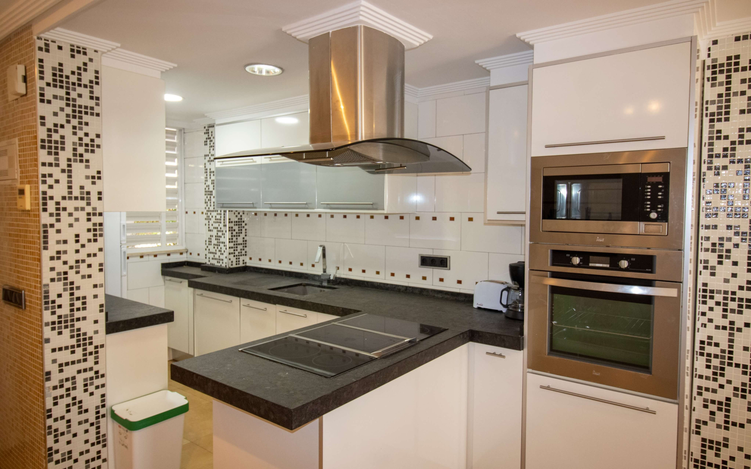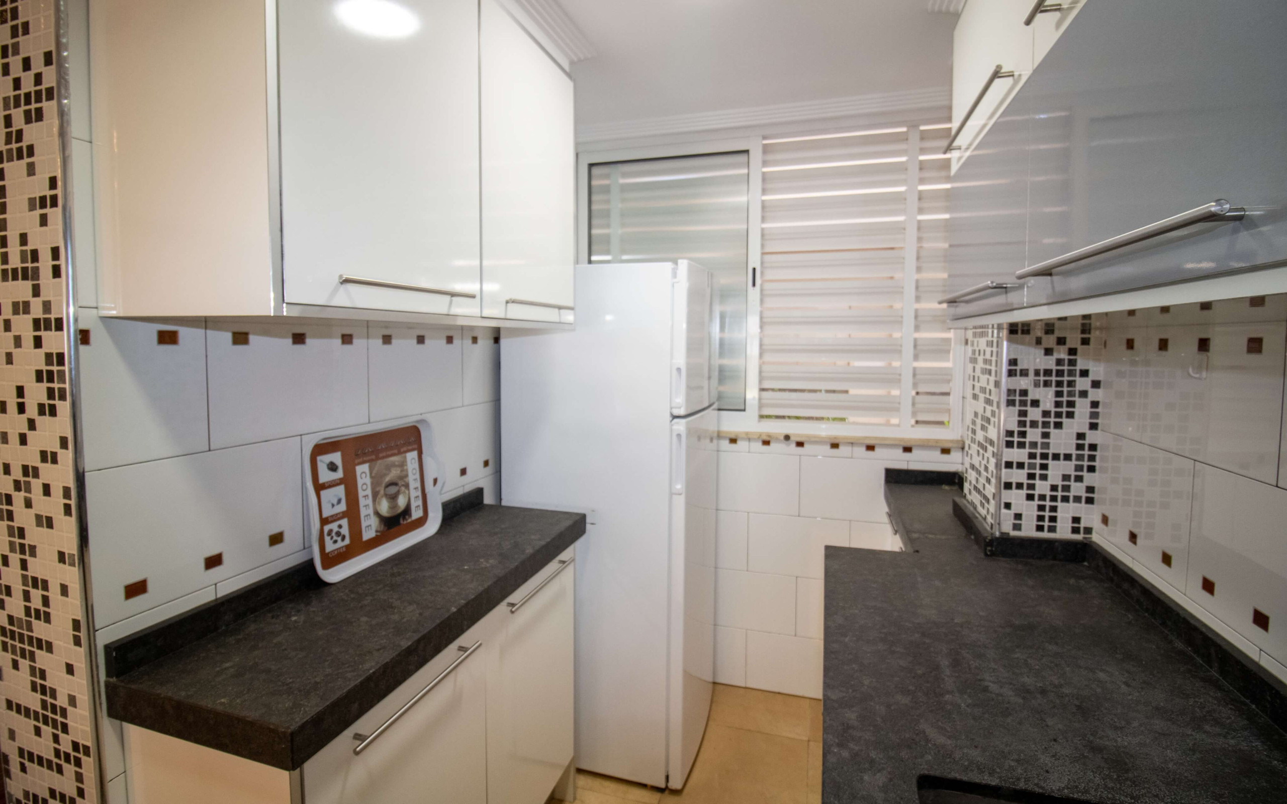 This beautiful flat of 70 square metres with capacity for 4 people, is distributed in 2 bedrooms, 1 bathroom and 1 toilet, a very well equipped open plan kitchen open to the living-dining room, which leads to a very spacious terrace with direct access to the communal garden and swimming pool. The terrace, which is south facing, has an awning that allows you to sit comfortably on it despite the hot summer sun.