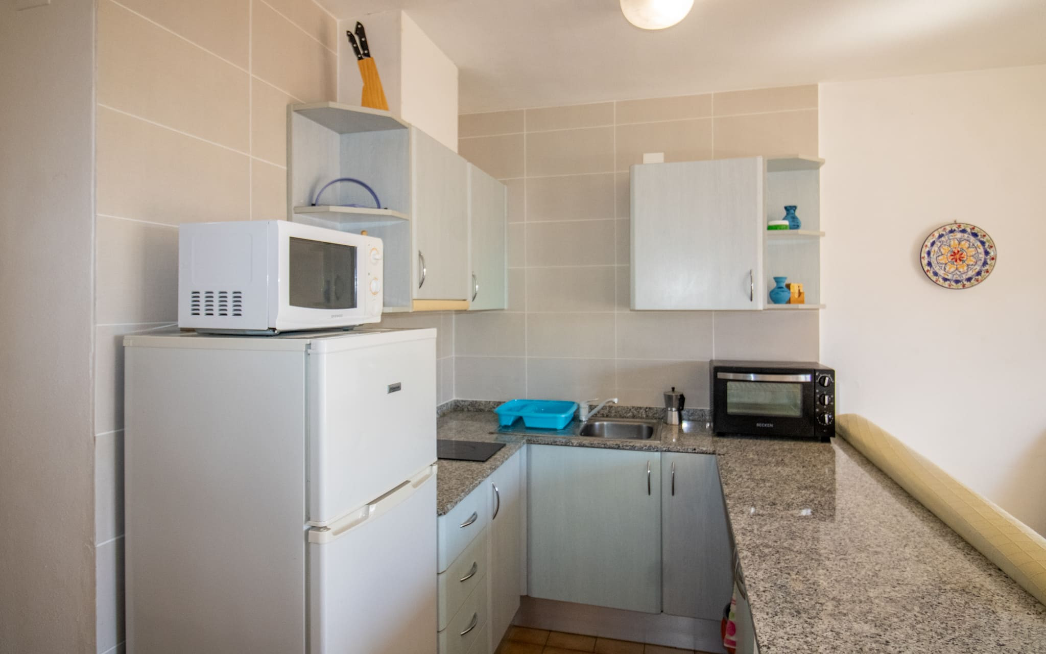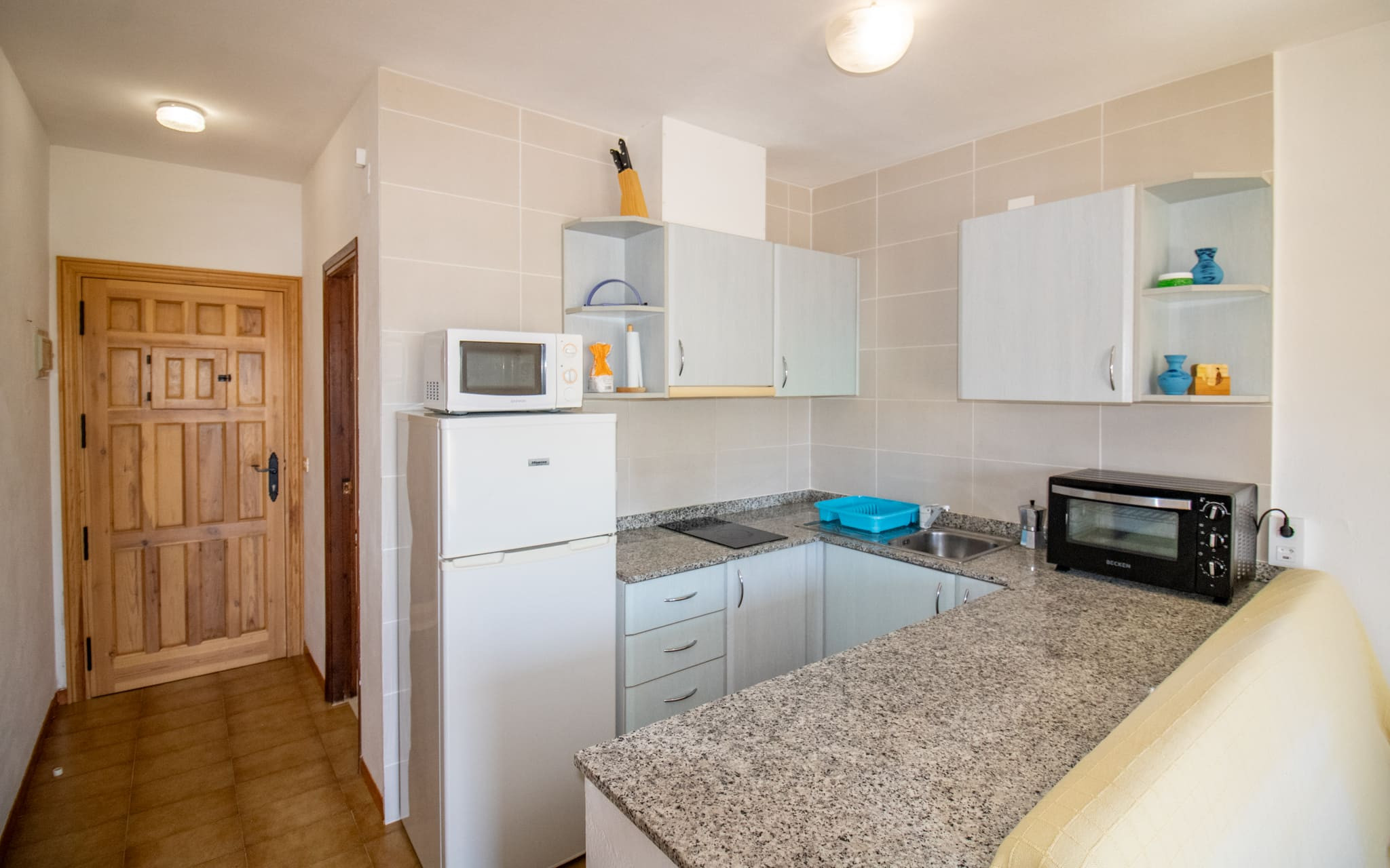In the hotplate of glass ceramics open plan kitchen, refrigerator, microwave, freezer, dishes/cutlery, kitchen utensils, coffee machine and kettle are provided.