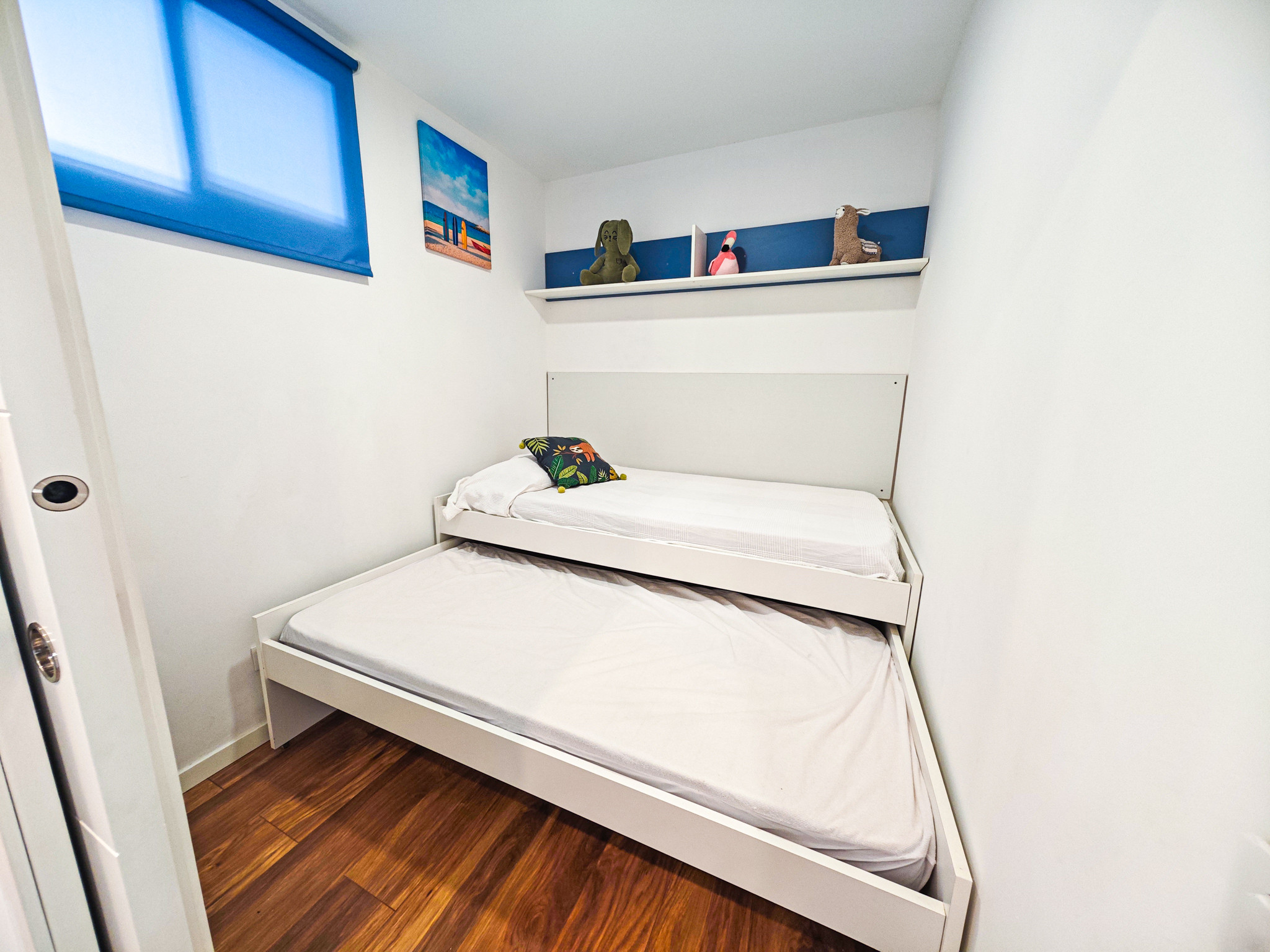 This cosy flat has a double bedroom + 1 "bunk bed" room with 2 beds but without windows, a full bathroom with shower, a modern and well-equipped kitchen, and a spacious living-dining room. Additionally, the apartment is equipped with air conditioning in the living room to ensure your comfort on hot days, and includes parking.