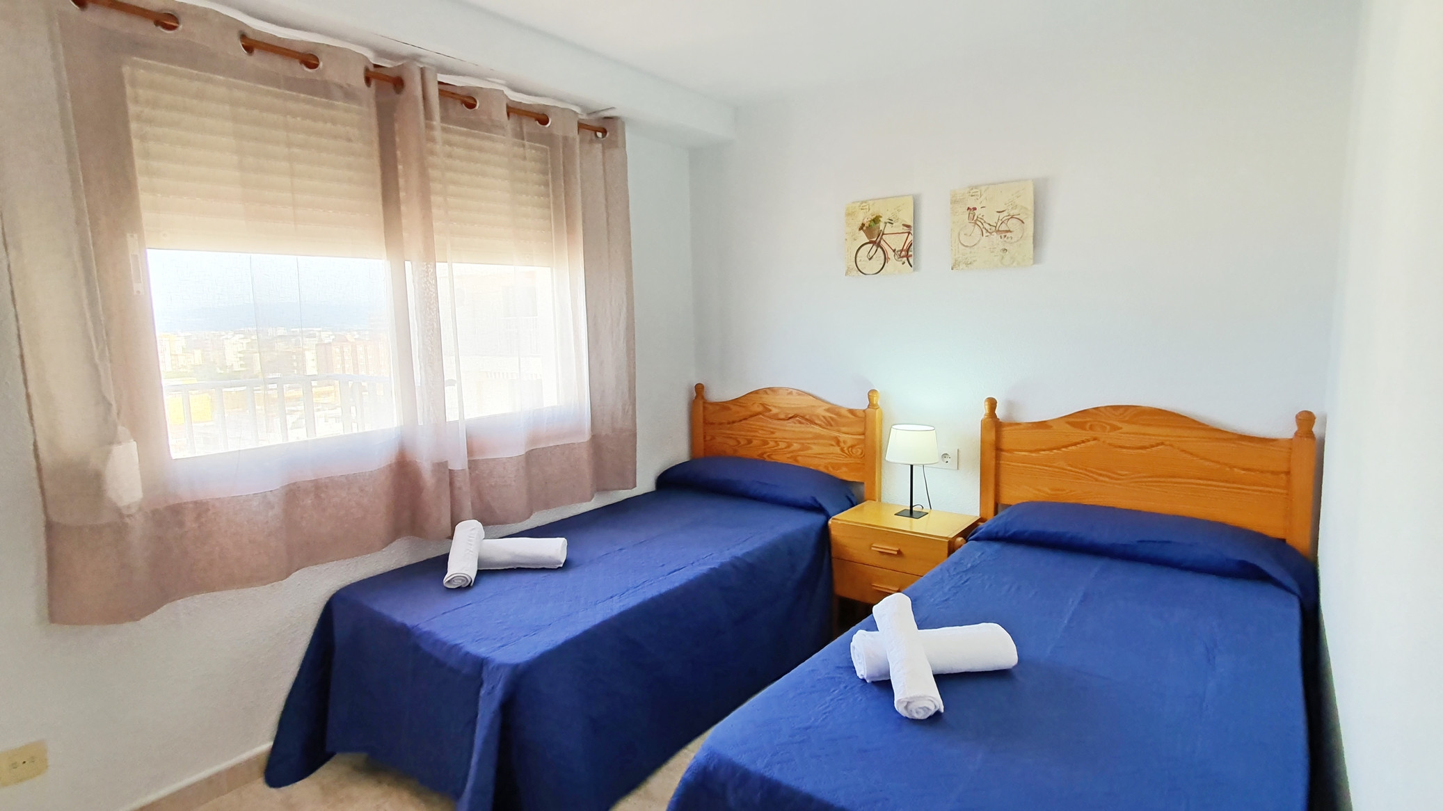 CONSISTS OF: 3 bedrooms with double bed, one bathroom with shower. Living room with a folding bed for 1 person. In one of the bedrooms (yellow bedroom) there is a ceiling fan. Fully equipped independent kitchen with hob. Large terrace with side views of the beach.