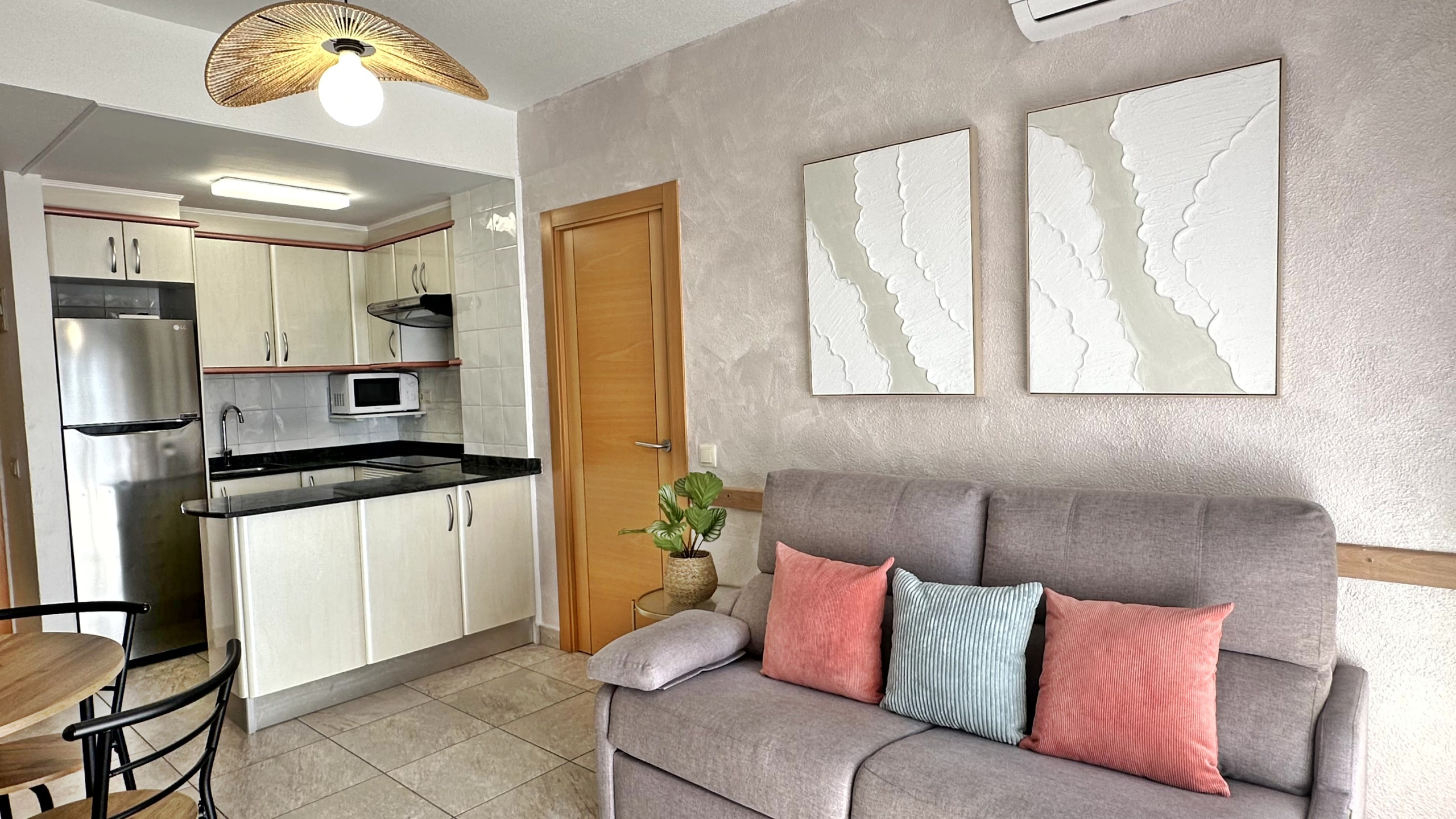 It consists of: 1 double bedroom (2 single beds), living room with sofa bed, fully equipped open-plan kitchen, 1 complete bathroom with shower, and terrace with spectacular side views of the beach and the passage.