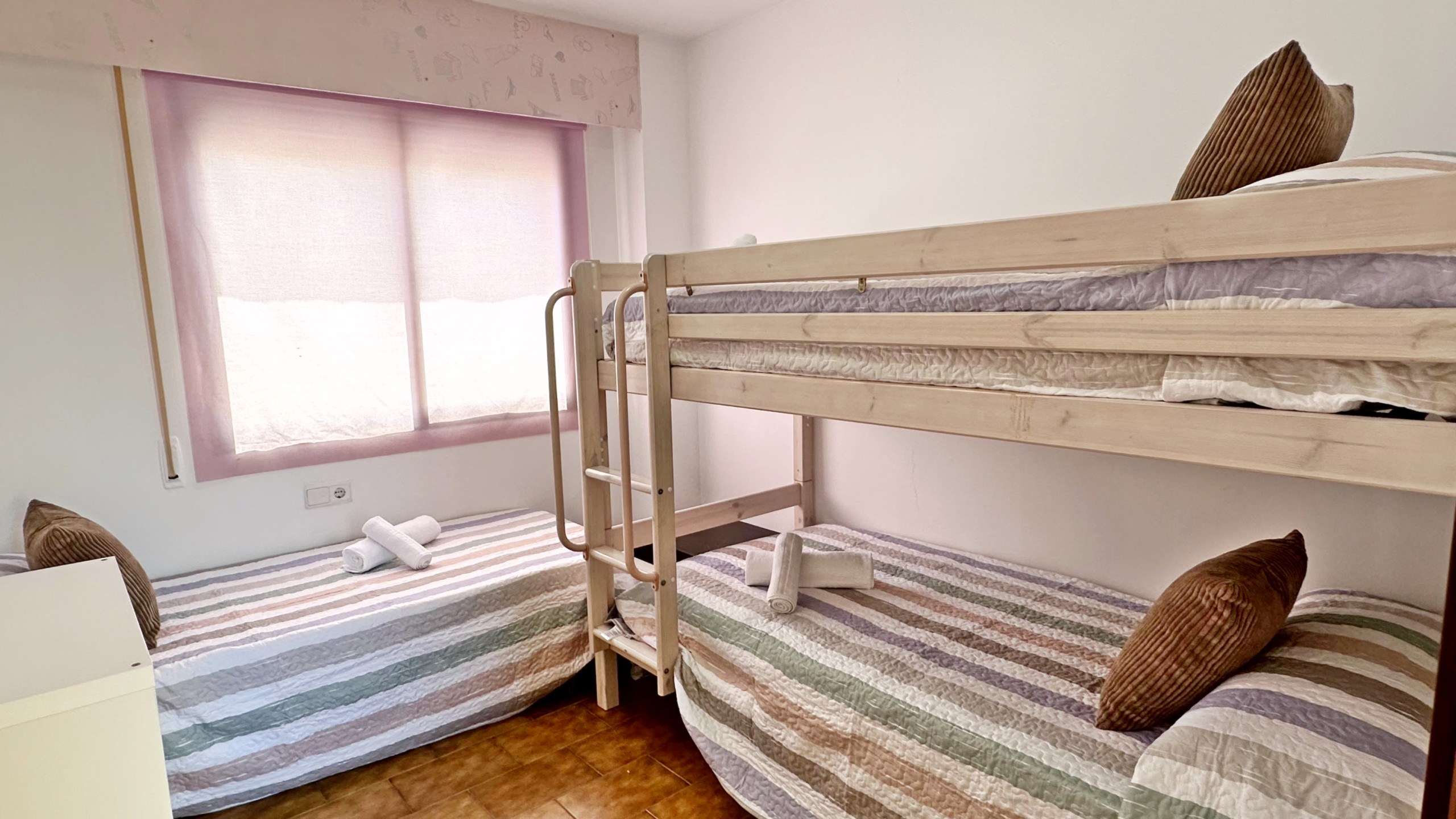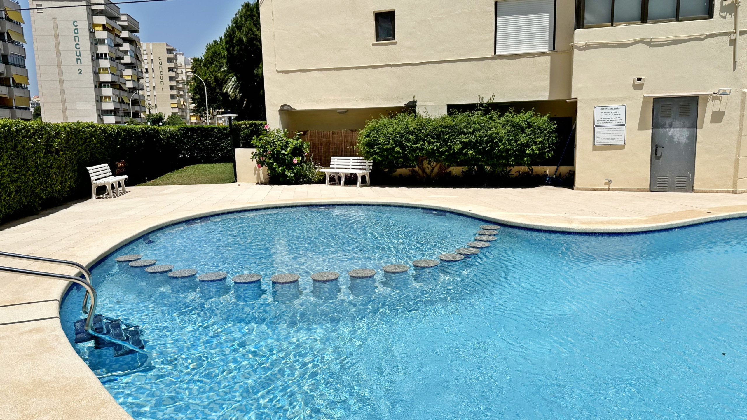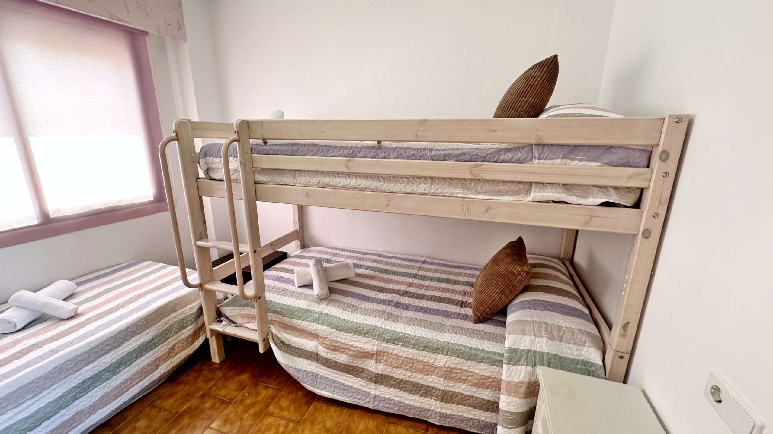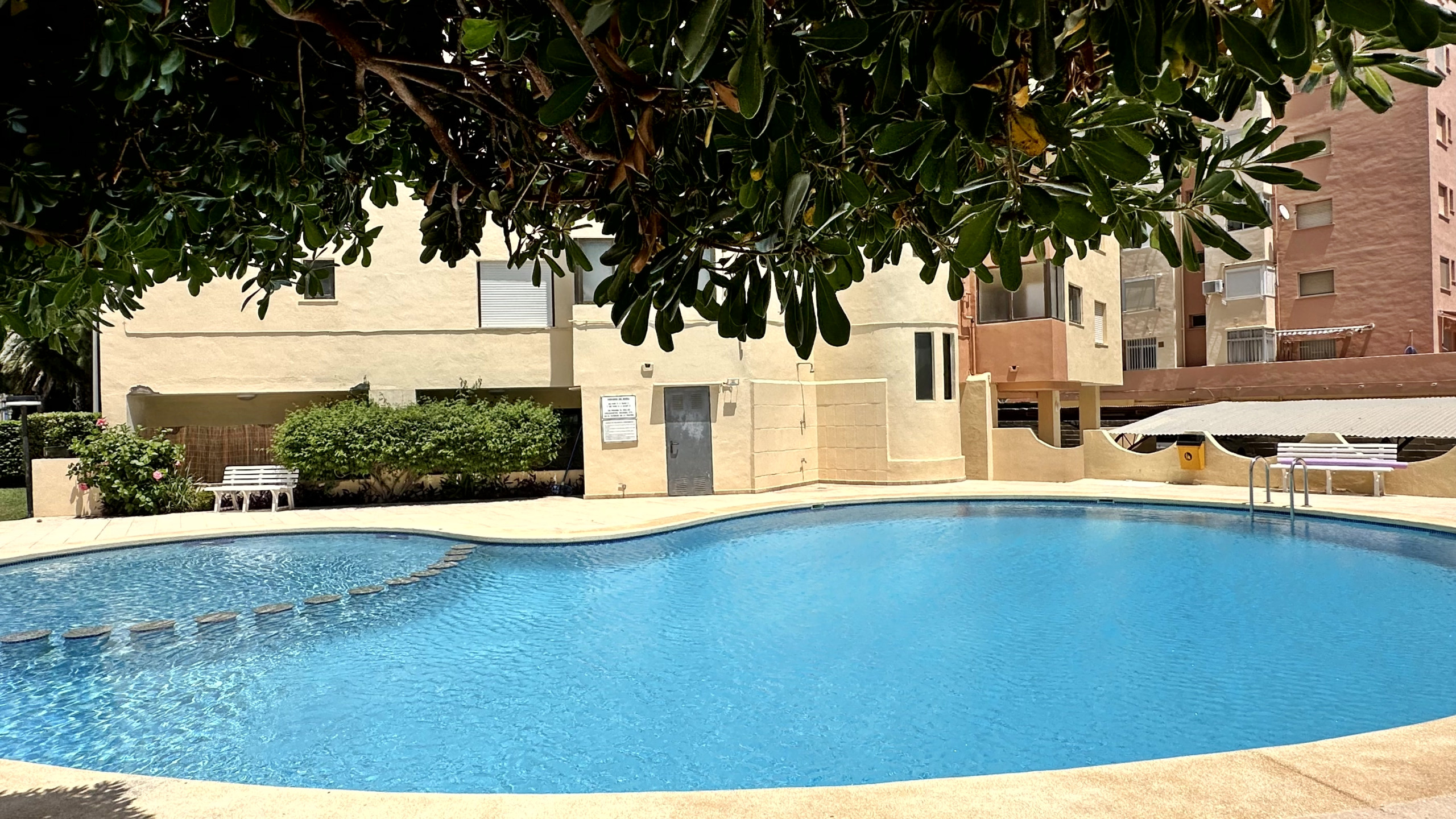 3-bedroom apartment located on the first line of Gandía beach with beautiful beach views, situated in a family-friendly and quiet area of Gandía beach. With swimming pool, children's pool and garage parking for one car.