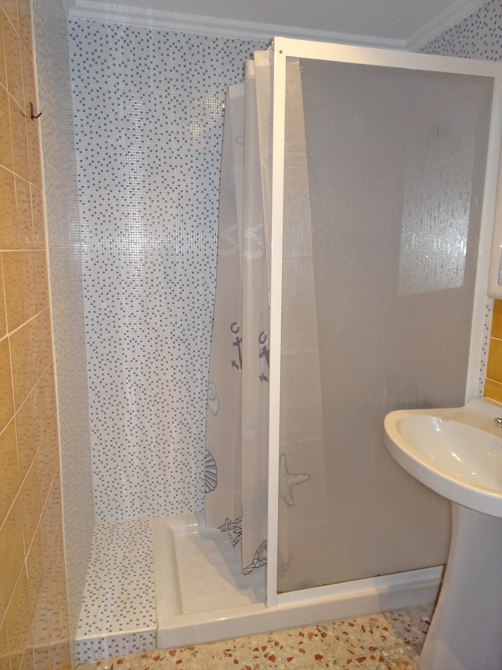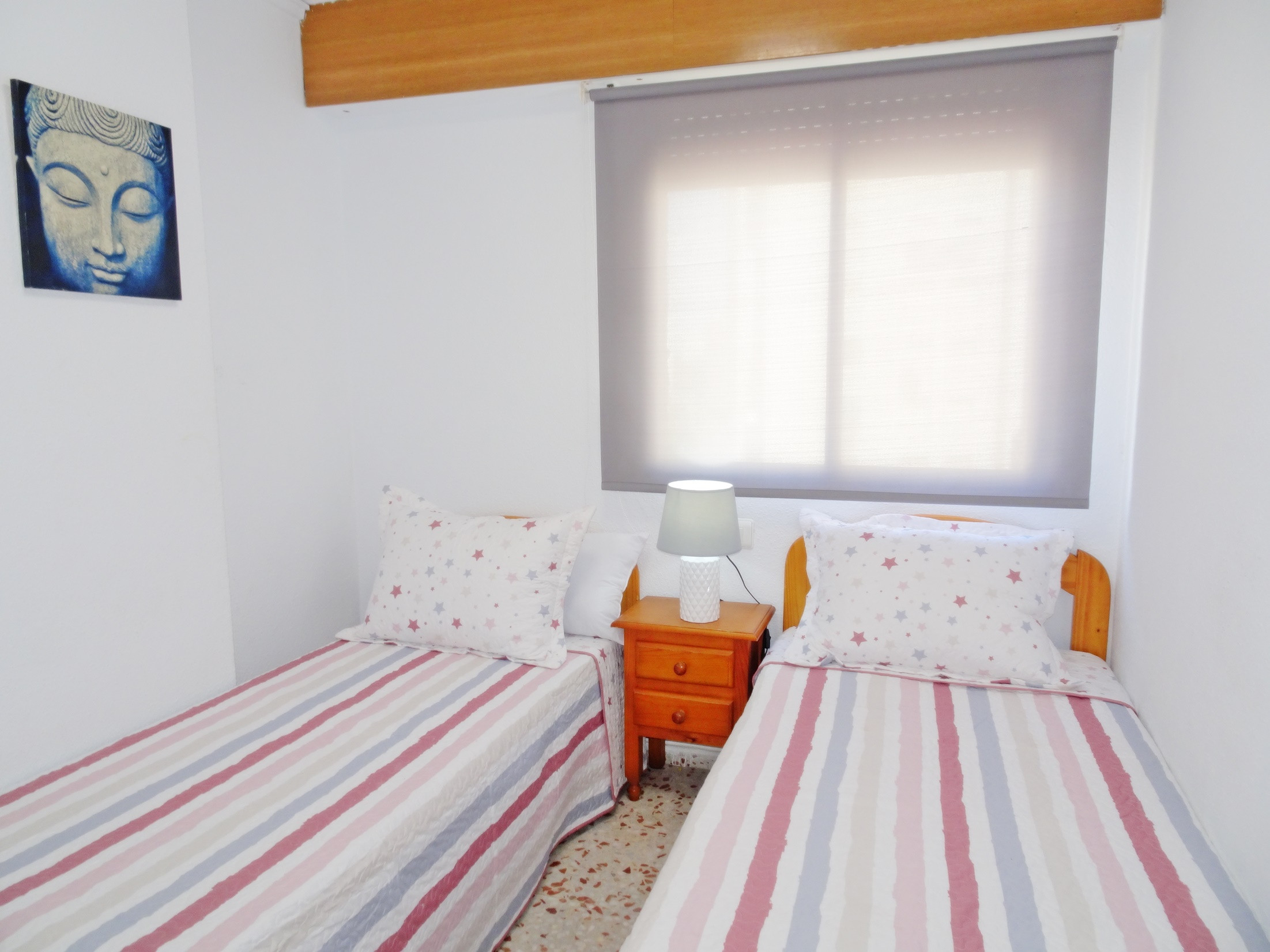 CONSISTS OF: 3 bedrooms with double bed, one bathroom with shower. Living room with a folding bed for 1 person. In one of the bedrooms (yellow bedroom) there is a ceiling fan. Fully equipped independent kitchen with hob. Large terrace with side views of the beach.