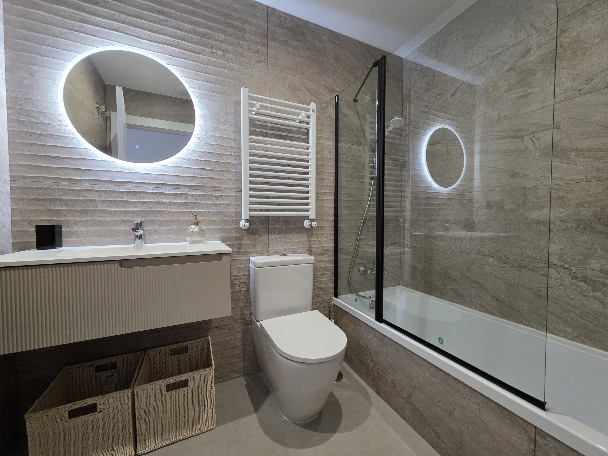 It has 3 bedrooms: one with a 150cm bed and en-suite bathroom, another with two single beds and another with a convertible sofa bed to 160cm. Open living room-kitchen and an additional full bathroom.