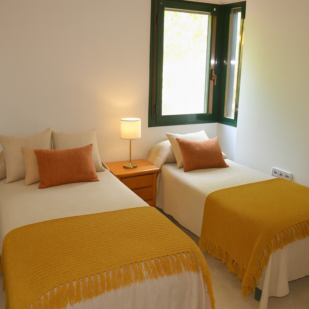 1 bedroom with 2 single beds, fan, blinds and access to the covered terrace.