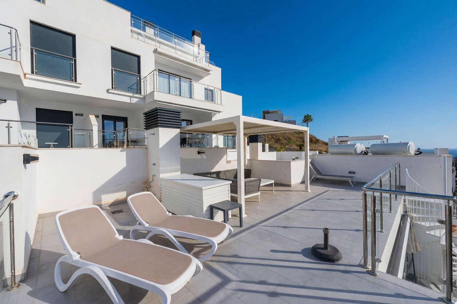 The accommodation has two terraces, a cooler one with a lounge area and another up the stairs with views of the sea and sun all day.