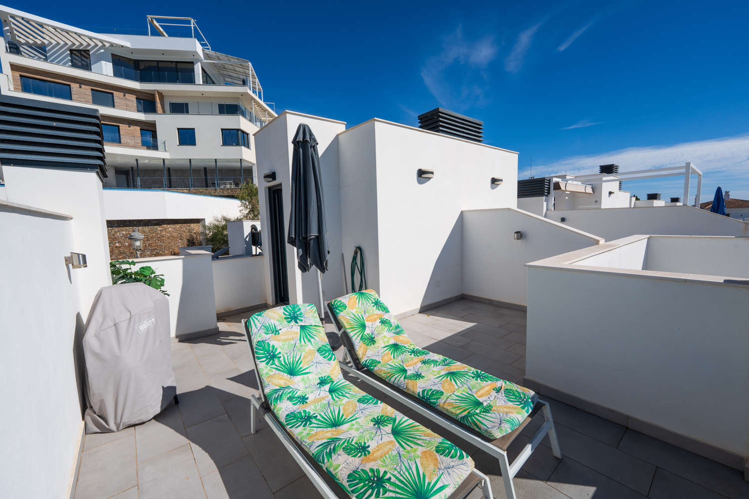 The entrance level offers not only the comfort of the bedrooms, but also direct access to the roof terrace, where you can relax outdoors and enjoy quiet moments in the warm sunshine, gaze at the stars at night or enjoy a barbecue.