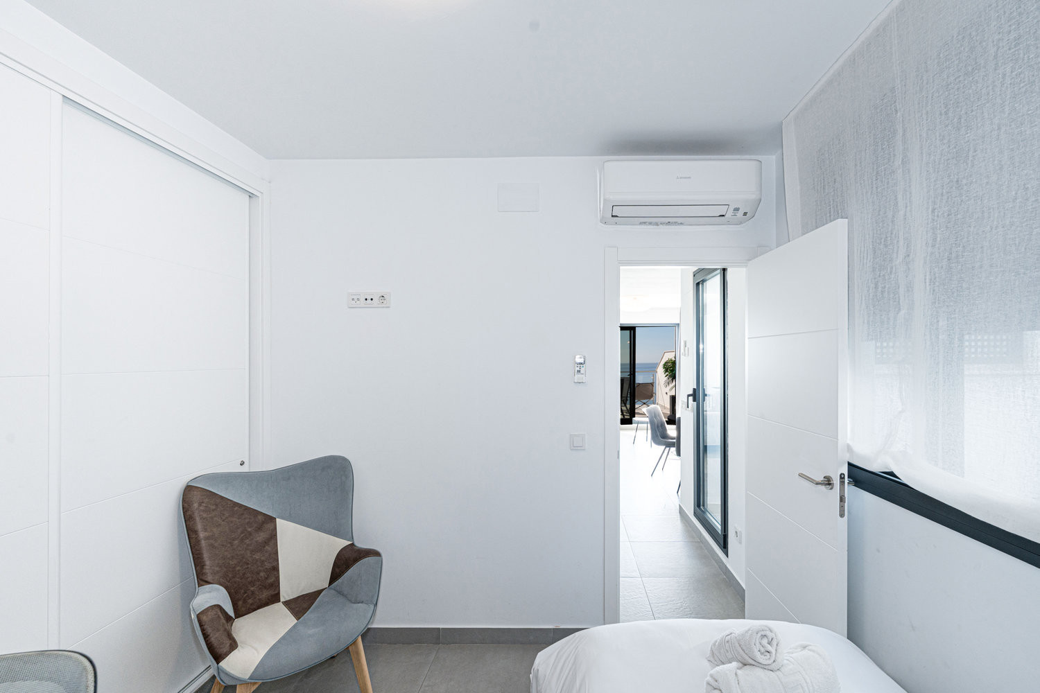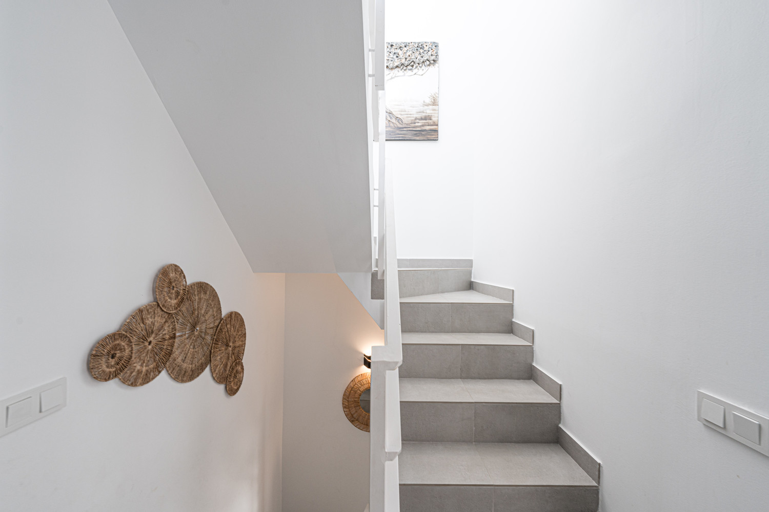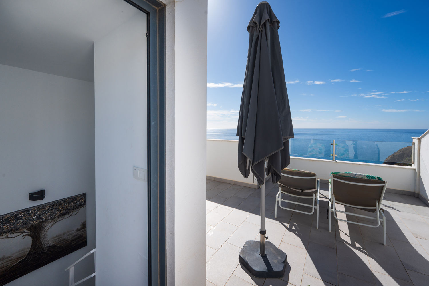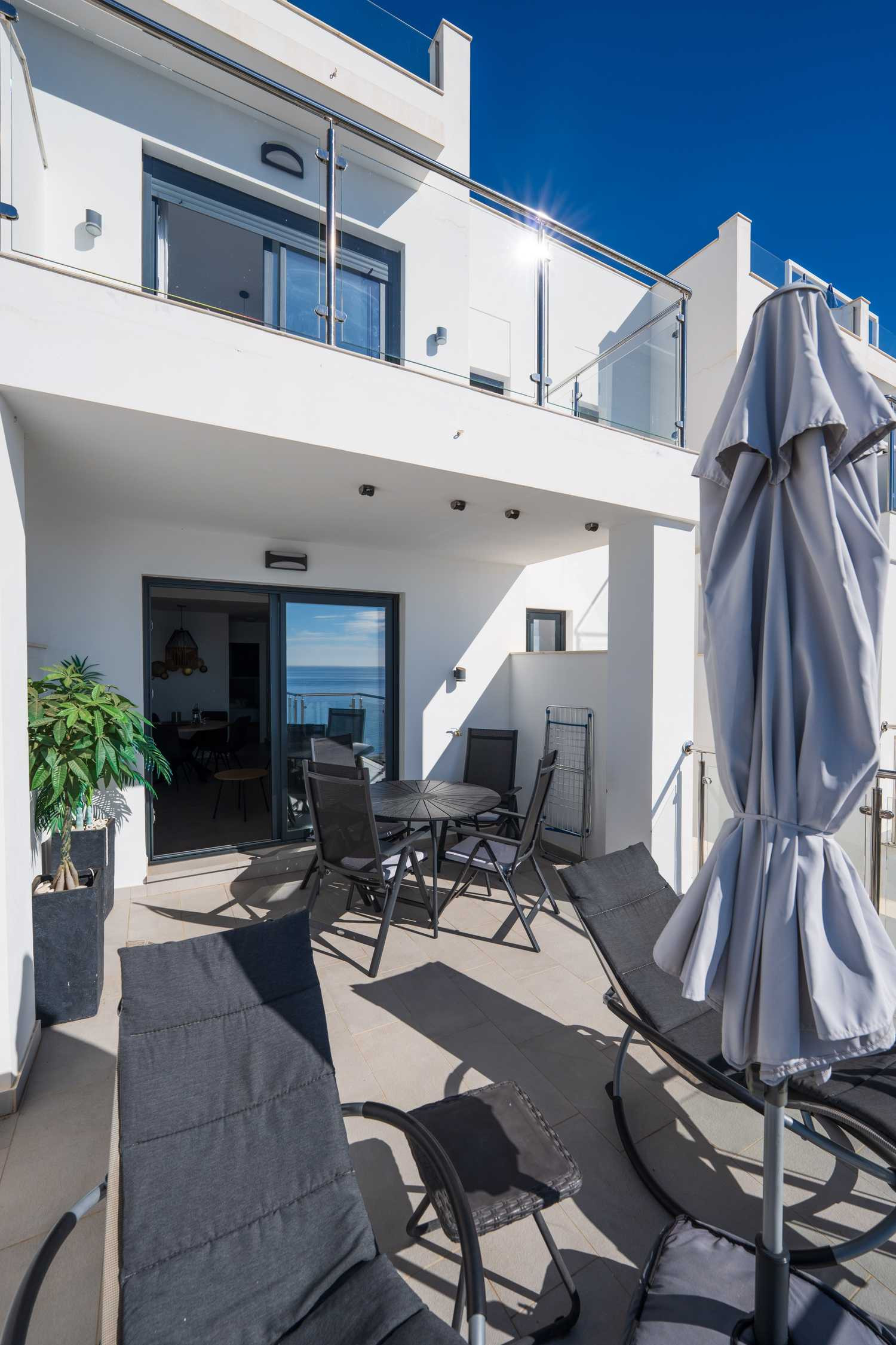 The accommodation has two terraces, a cooler one with a lounge area and another up the stairs with views of the sea and sun all day.