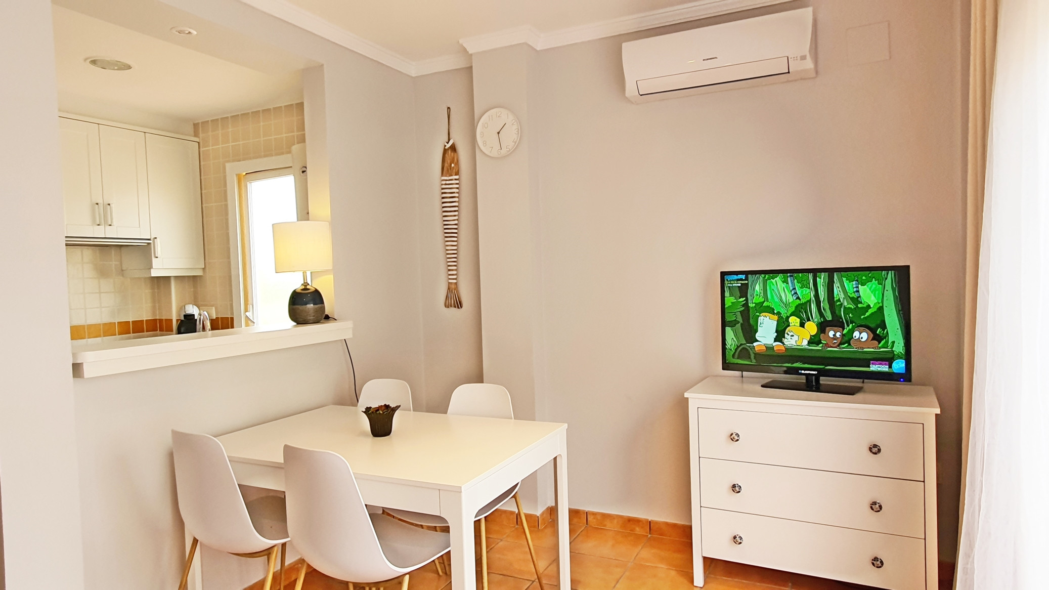 EQUIPPED WITH: TV, Washing Machine, Fridge, Hob, Microwave, Oven, Toaster, Iron and Ironing Board. IT HAS AIR CONDITIONING IN THE LIVING ROOM and MAIN BEDROOM.