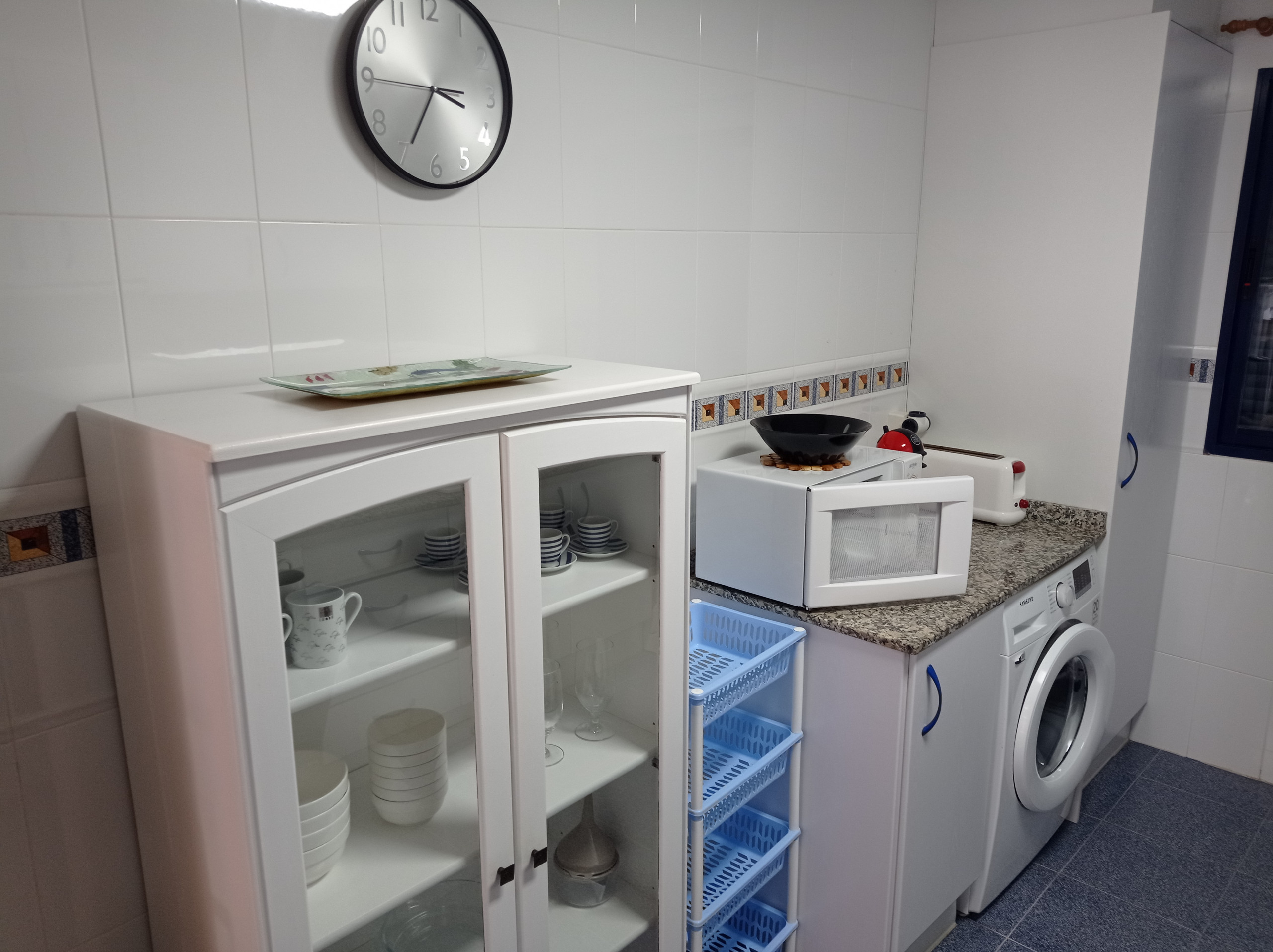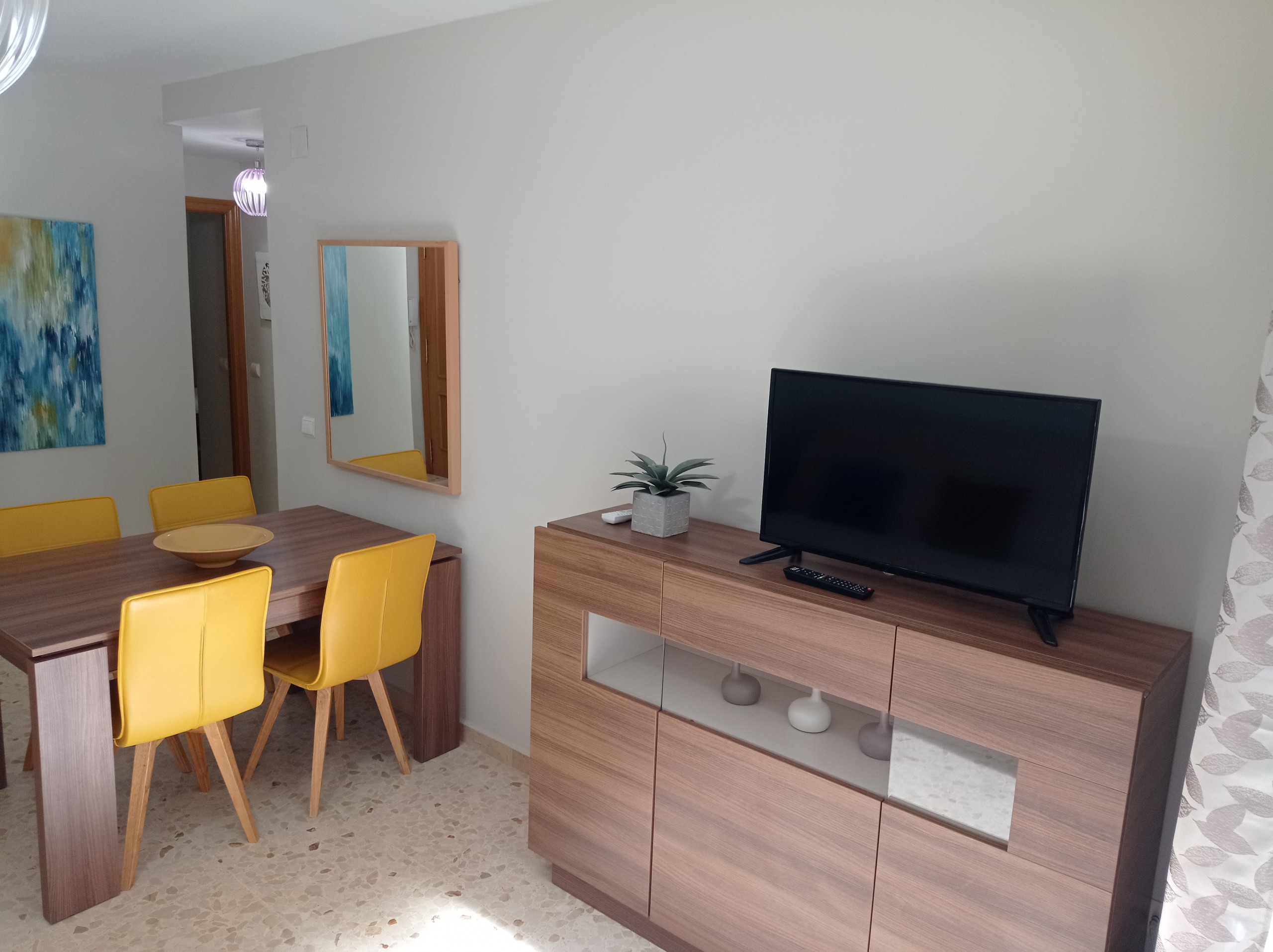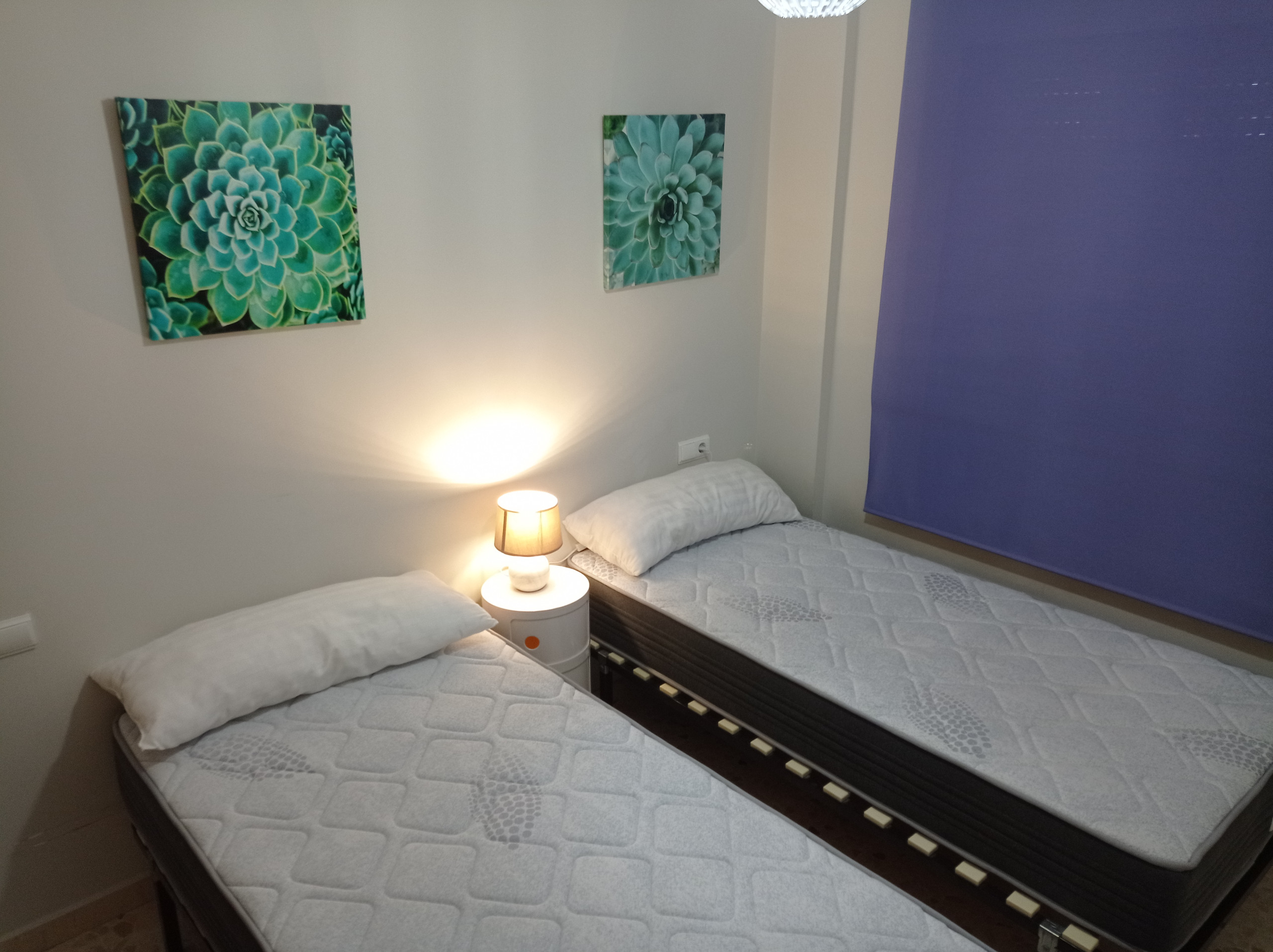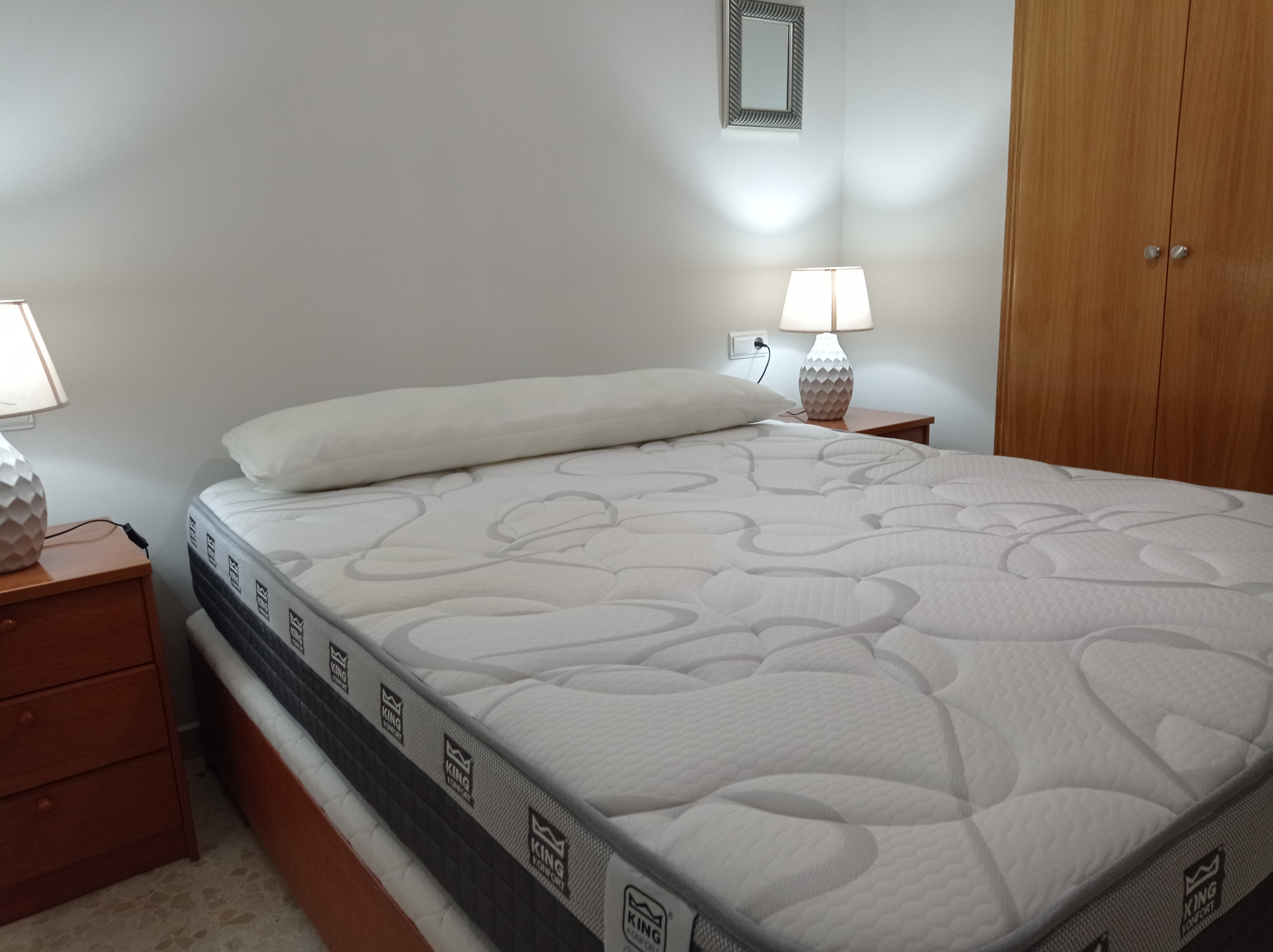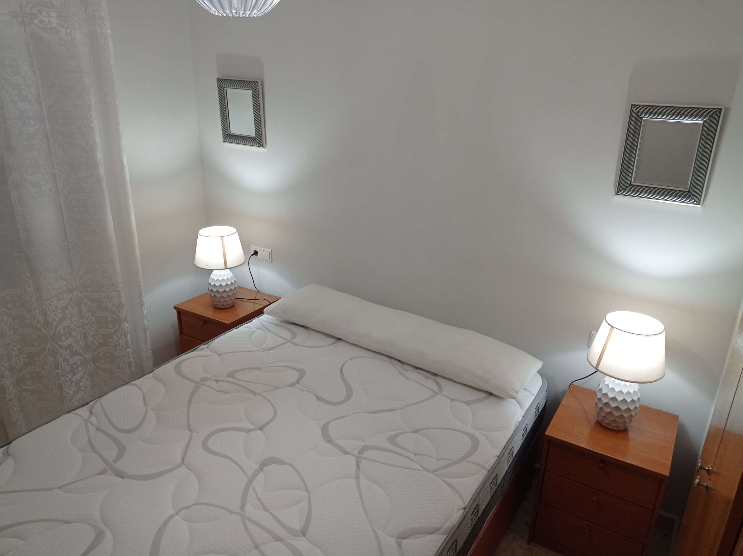 Small and comfortable accommodation on the first floor (no lift). It has a bedroom with a triple bunk bed, another with a double bed. The latter with a ceiling fan. Small and practical bathroom with shower tray. The common area, where you will spend most of your time, consists of a living and dining area, next to the kitchen with a central island, with a large window and access to a small balcony with views of the iconic sheds of the port of Gandia.