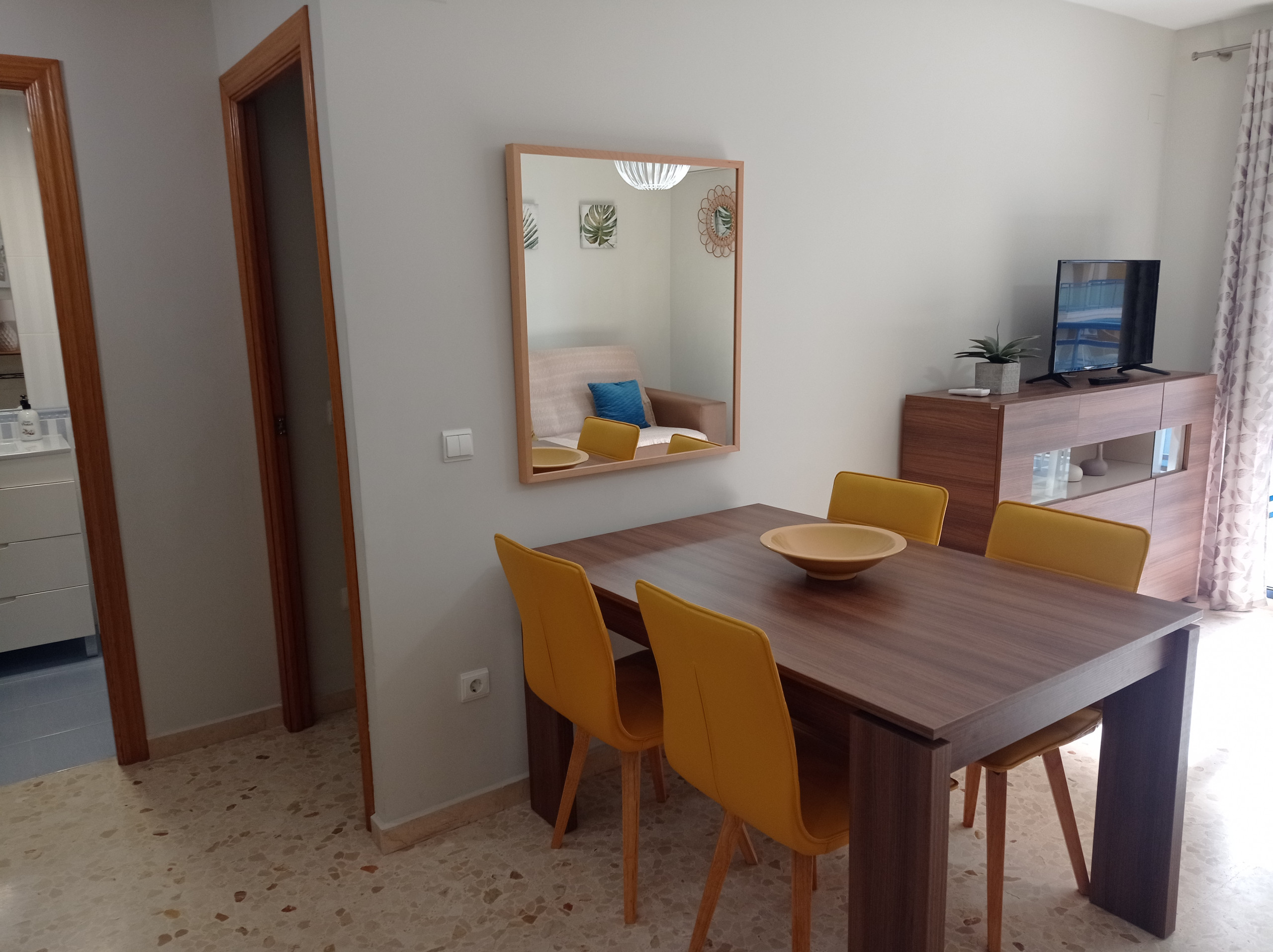 Nice and cosy two-bedroom apartment with a full bathroom and a toilet. Modern and practical furniture, thus ensuring comfortable and relaxing holidays. Apartment with South-East to North-West orientation, entirely exterior except for bathrooms, with air conditioning in the living-dining room. Bright and spacious kitchen, equipped with dishwasher. Cosy living-dining room, from which access is gained to a wide furnished terrace with awning and curtain-awning, with fabulous views of common areas and swimming pool. Includes garage space, equipped with WIFI service and dishwasher. NO PETS ALLOWED.