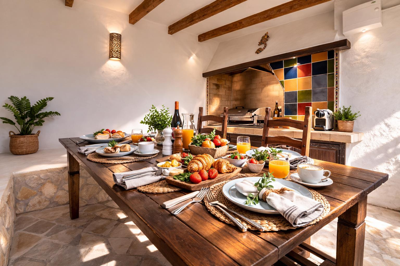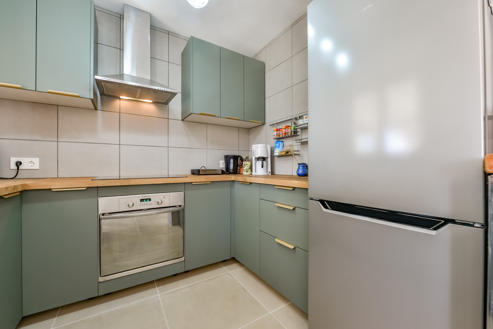 In the butane gas open plan kitchen, refrigerator, microwave, oven, freezer, washing machine, dishwasher, dishes/cutlery, kitchen utensils, coffee machine and toaster are provided.