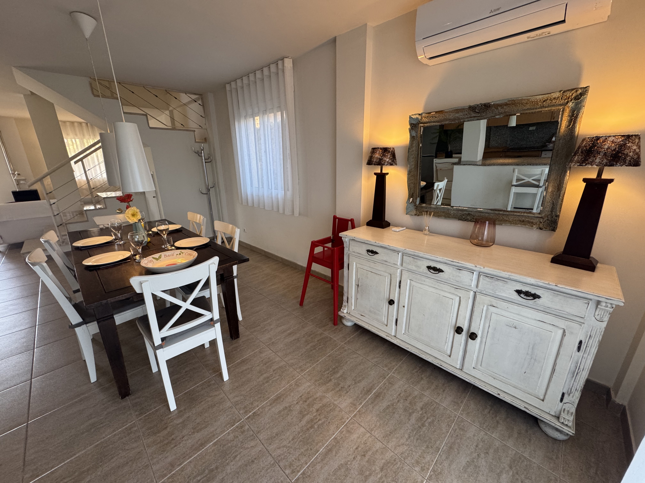 It is meticulously equipped and is only 1 km from the beach. Located in a quiet residential area, it offers a comfortable and relaxing stay with all the amenities you need. Upstairs, you will find three bedrooms, one of them with a private bathroom, and another shared bathroom. The master bedroom has air conditioning, ensuring a cool environment on the upper floor of the house.